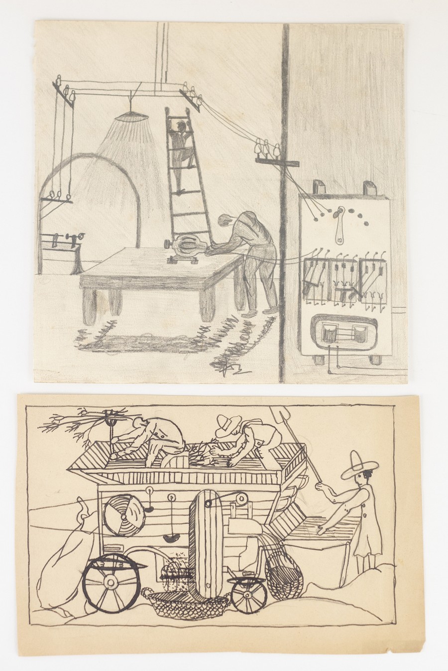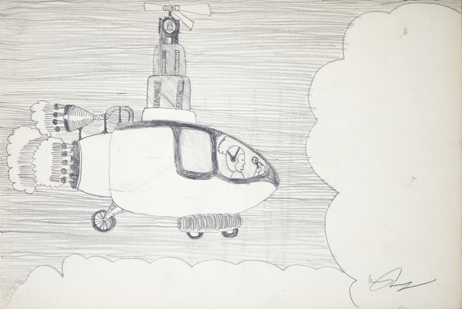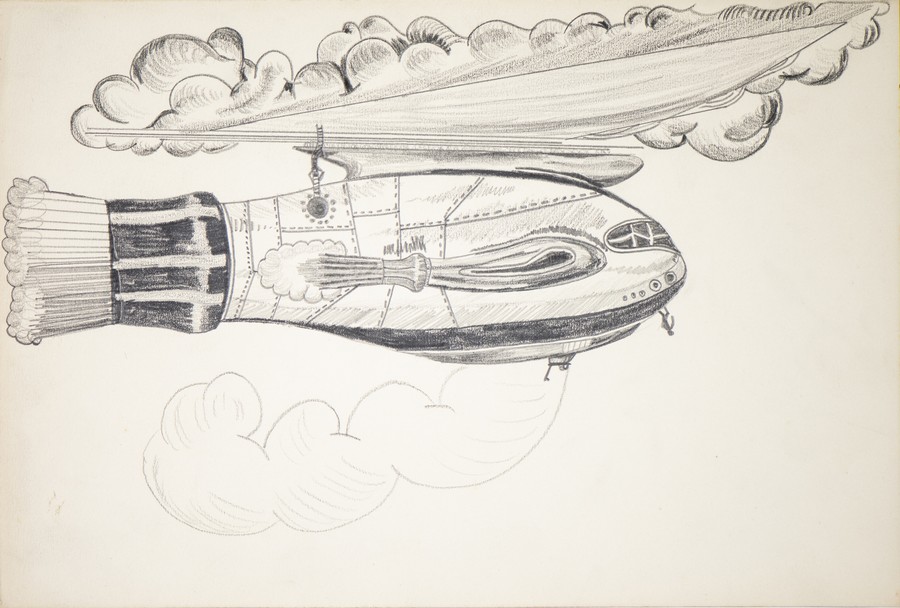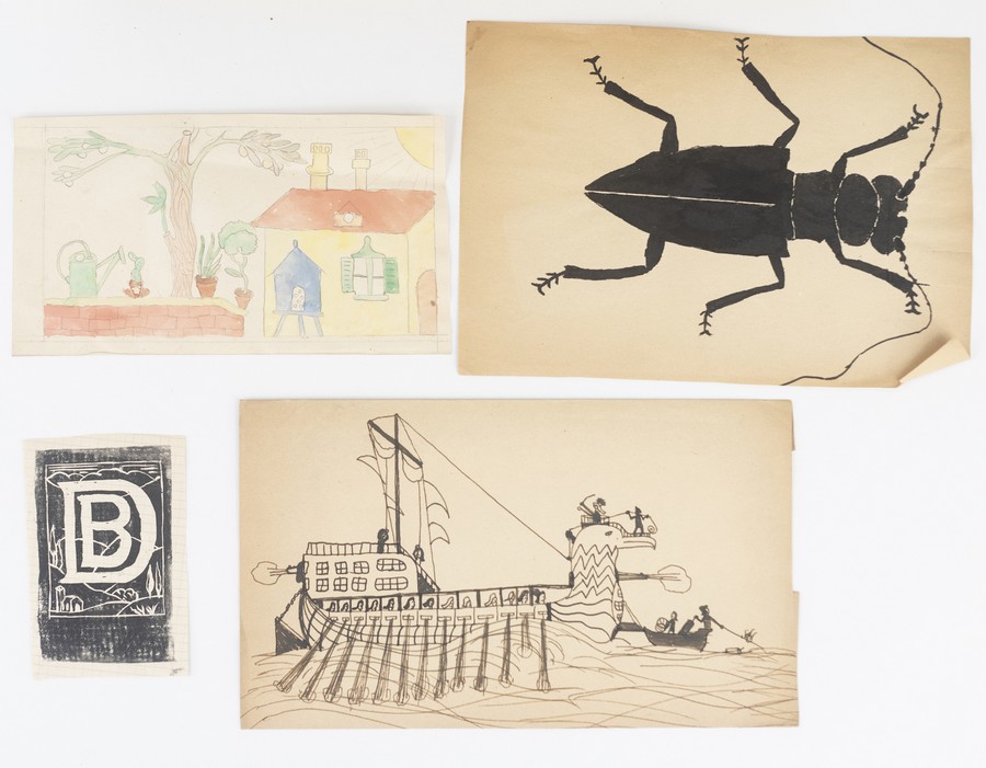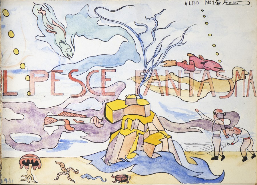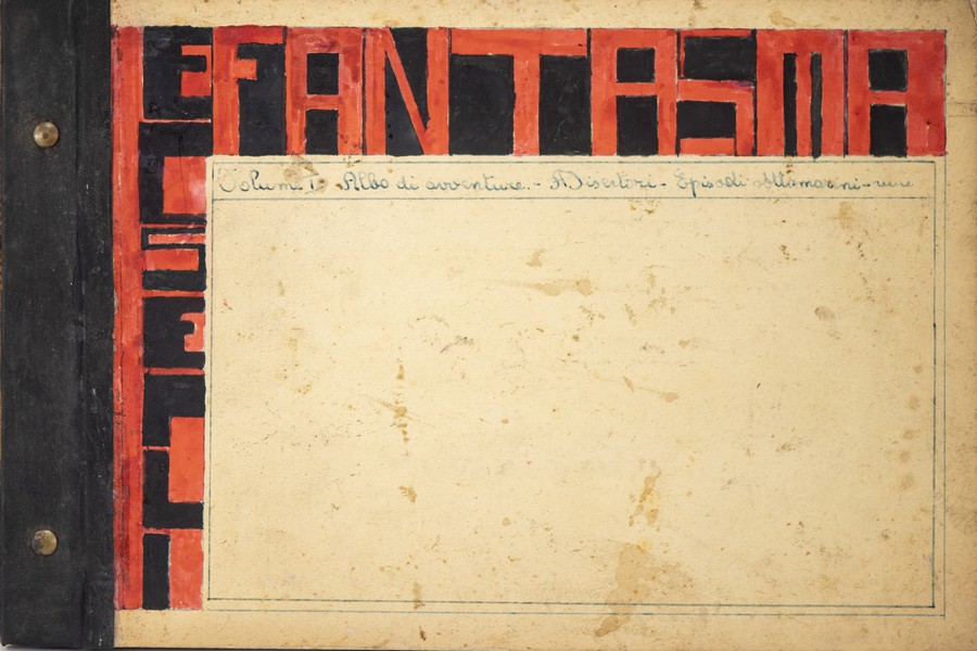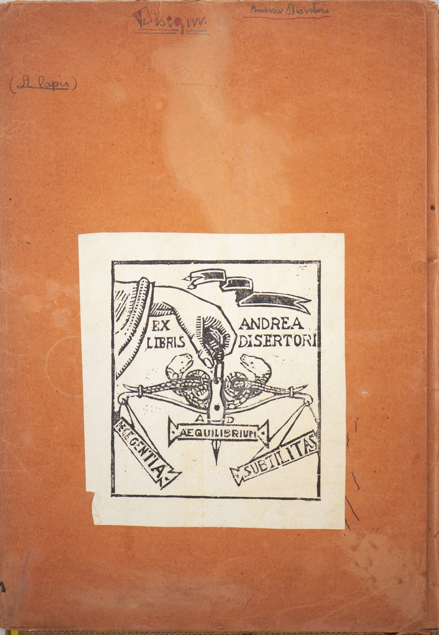 Disertori Andrea (n. 1927) Busta a sorpresa: libro a fumetti "Il pesce fantasma" e altri sketches, disegni ed exlibris. . 1941. tecniche miste su carta. Cm 33,00 x 22,00. Nella busta trovano spazio : un libro a fumetti del 1941 completo e molto raro. 4 disegni di oggetti volanti 31 x 21cm, numerosi disegni di animali fantastici, modelli di macchine e personaggi della fantasia e tre ex-libris tecnica xilografica di varie dimensioni e di epoche anche antecedenti alla data del libro per cui si ritengono opere giovanili in cartellina d'epoca.