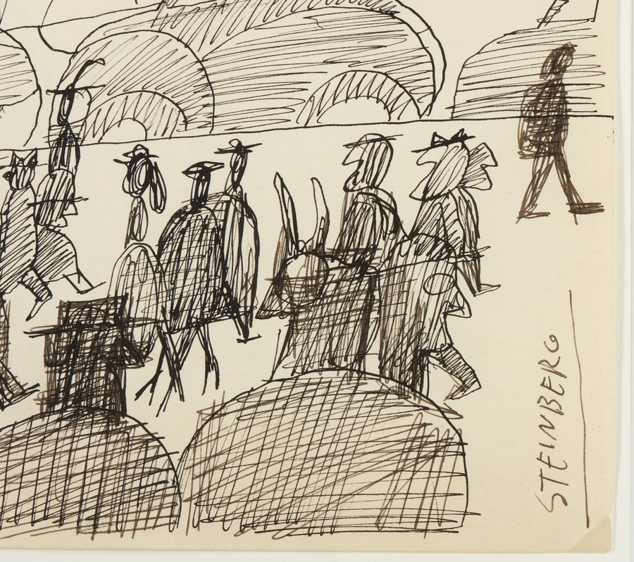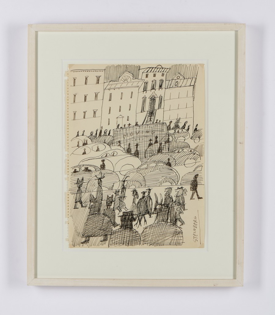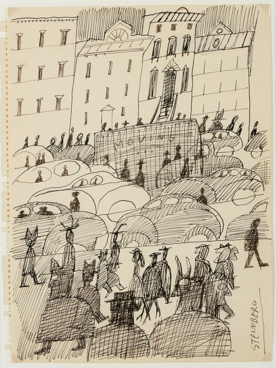 Illustrazione originale realizzata da Steinberg nel 1954 durante un viaggio negli Stati Uniti del sud (Virginia e Carolina) insieme all'amico architetto Aldo Buzzi. La presente opera fu poi pubblicata da Buzzi nel suo celebre libro "Piccolo diario americano" dall'editore All'insegna del Pesce d'Oro nel 1974. Opera esposta presso la mostra "Aldo Buzzi e Saul Steinberg: un’amicizia tra letteratura, arte e cibo", tenutasi presso la Biblioteca Braidense di Milano nel 2022 e pubblicata nell'omonimo catalogo a pag. 62. "Una mattina di febbraio, affacciandomi alla finestra, vidi giù una grande Cadillac nera. Ricominciava la meraviglia di viaggiare in un paese sconosciuto, di arrivare ogni sera in un posto nuovo dove tutto si presenta con l’aspetto unico e irripetibile che hanno le cose la prima volta che si vedono, che è un peccato sciupare con una più approfondita conoscenza (Aldo Buzzi)".