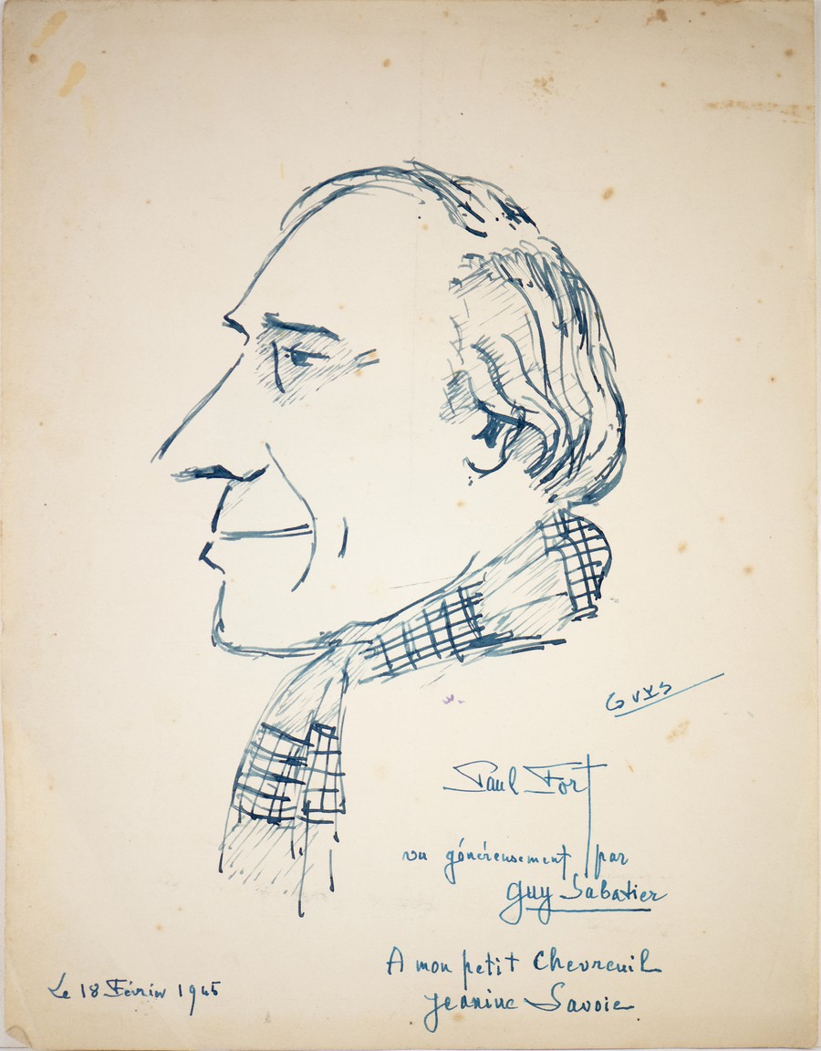 Guys Ritratto d'epoca del grande poeta francese Paul Fort. 1945. China su carta. Cm 21,00 x 27,00. il foglio si presenta firmato e dedicato