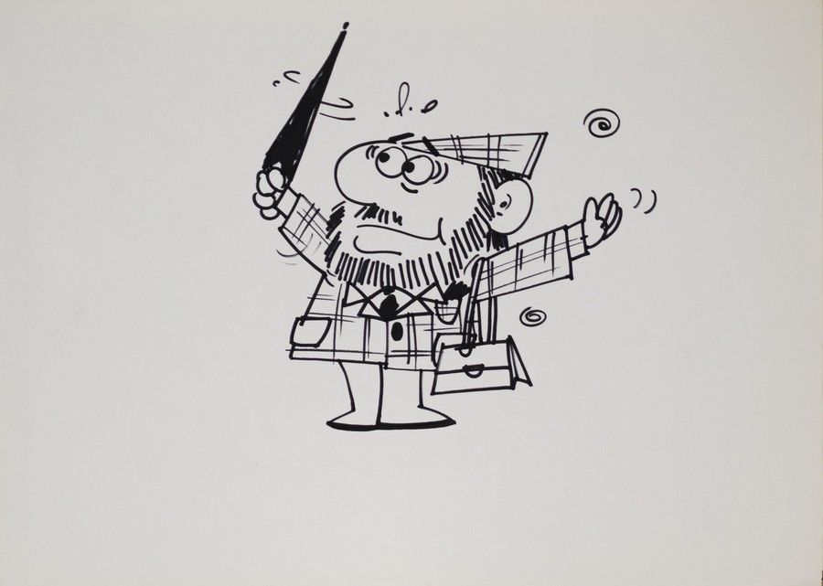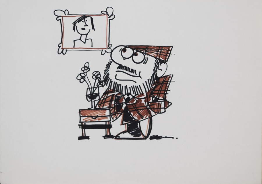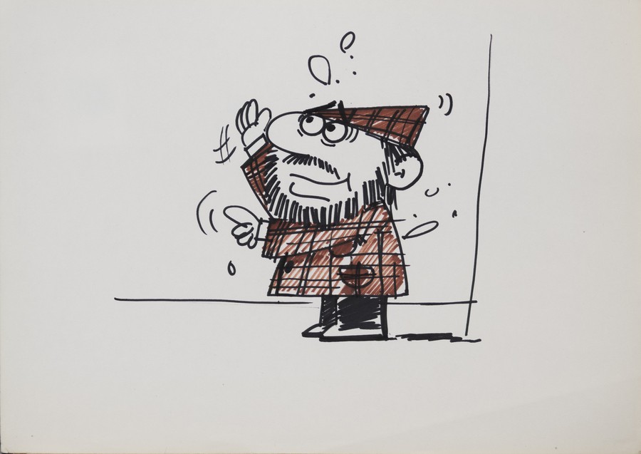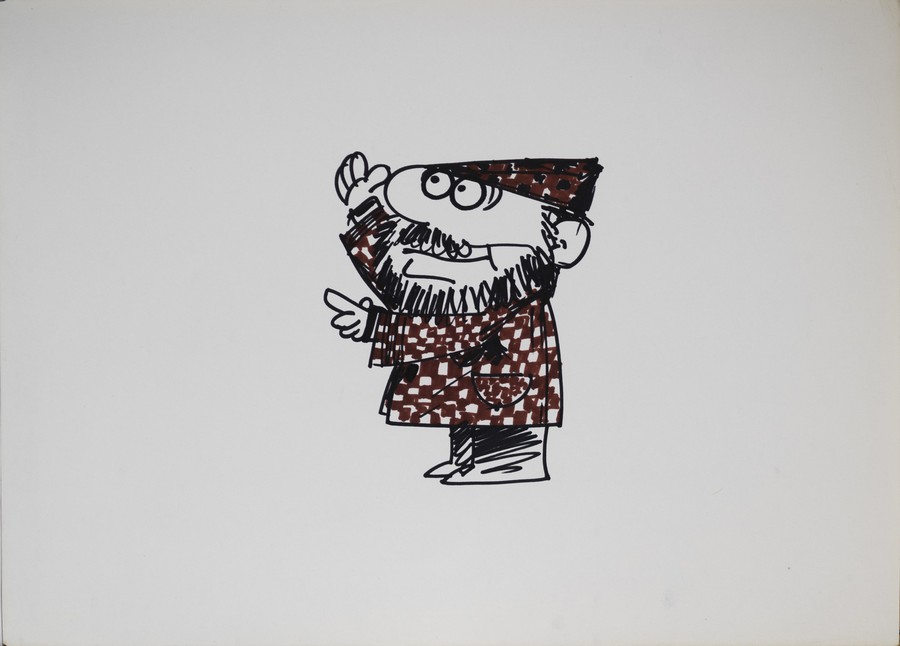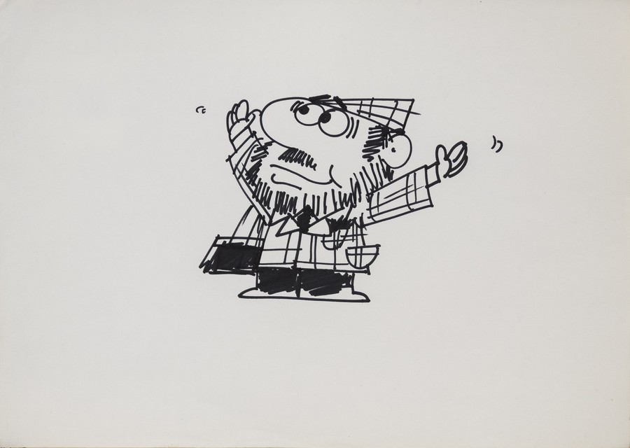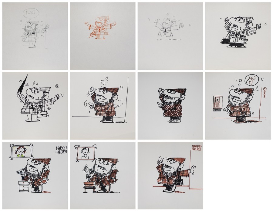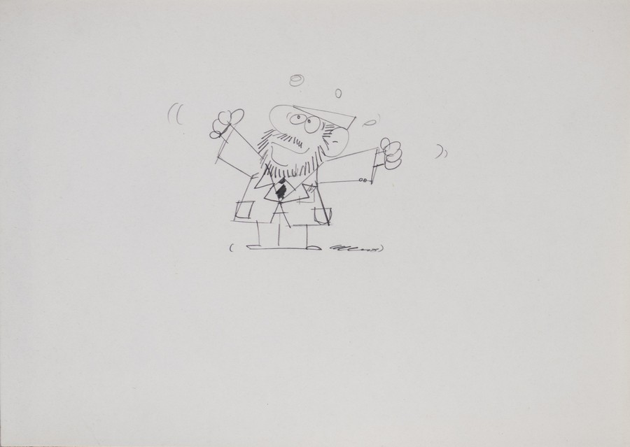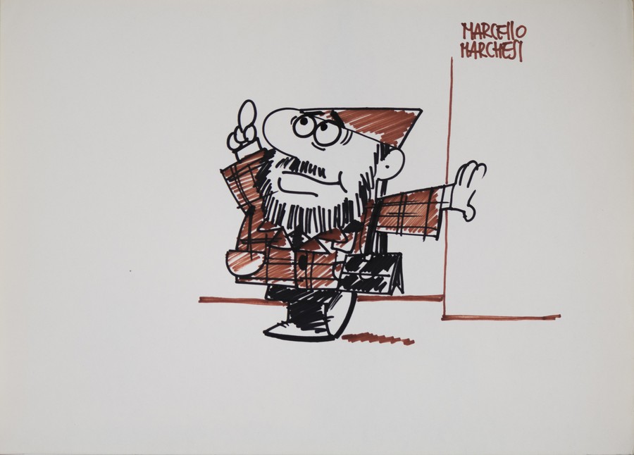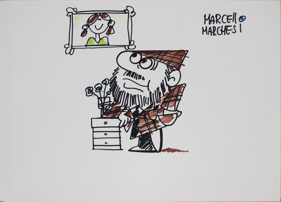 AUTORE IGNOTO Vignette dedicate a Marcello Marchesi. 1960. pennarelli colorati grafiti e pastelli su carta. Cm 35,00 x 25,00. Le vignette si presentano ciascuna diversa, non firmate, ma per la carta e il tratto sicuramente risalenti agli anni 60, periodo di maggiore splendore per Marcello Marchesi come autore televisivo per Pippo Baudo, Walter Chiari, Sophia Loren, dopo aver scritto per Totò, Macario, Alberto Sordi, Tognazzi, Wanda Osiris e tanti altri.