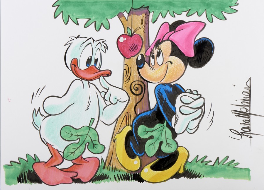 MOLINARI LARA (n. 1970) Paperino e Minnie. pennarelli su carta. Cm 33,00 x 24,00. firma al lato destro