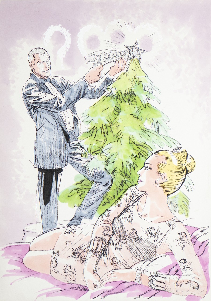 Paludetti Franco (1924 - 2008) Diabolik e Eva Kant festeggiano il 2000. 1999. chine e tempere colorate su carta. Cm 23,00 x 34,00. 2) 21 x 29 cm