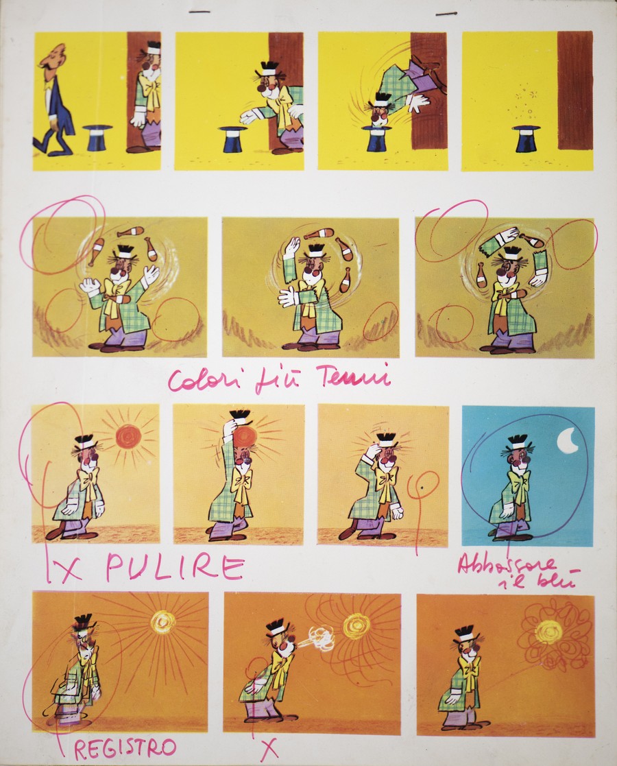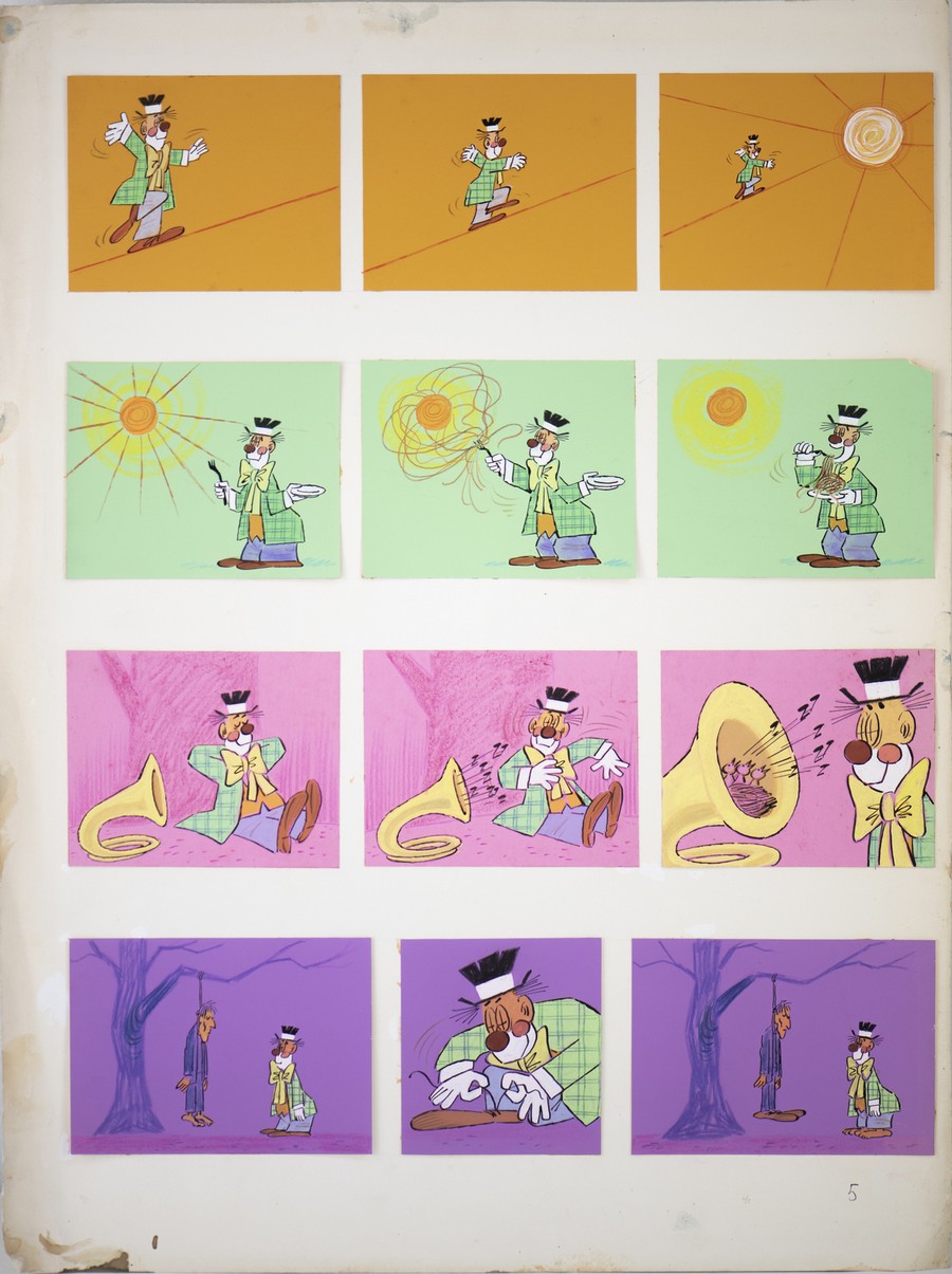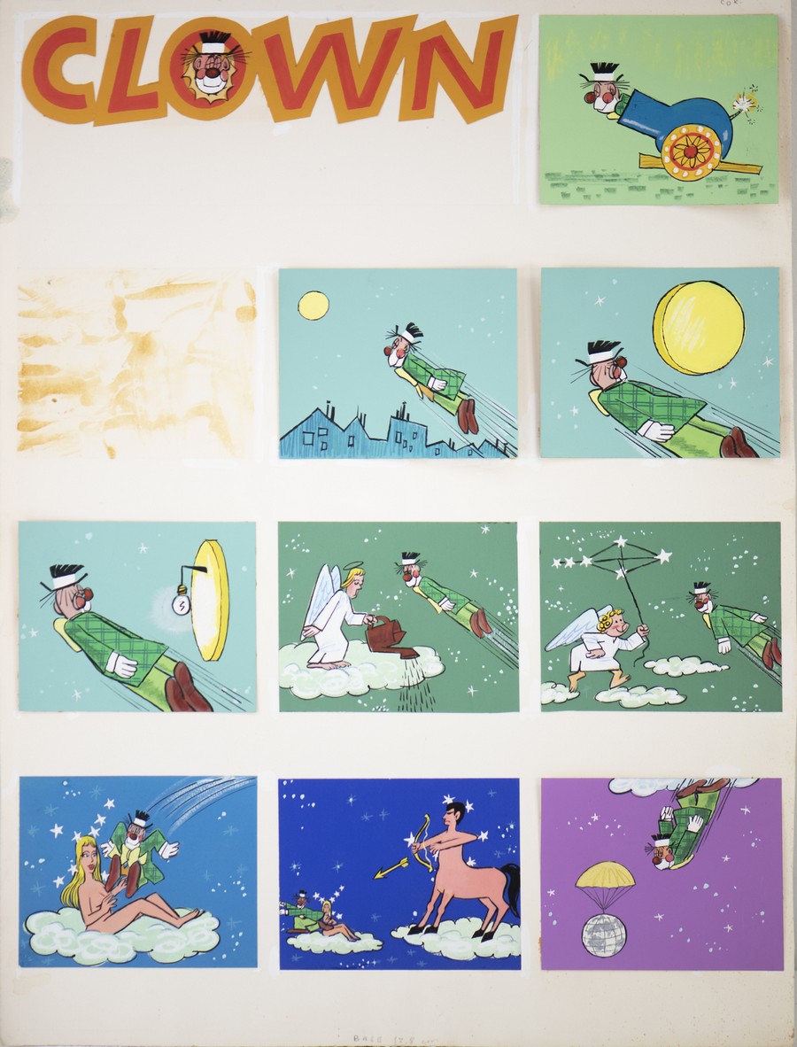 Peroni Carlo (1929 - 2011) La serie de I Clown . China e tempera su carta. Cm 40,00 x 53,00. Due grandi tavole che contengono una serie di vignette quasi a formare una striscia animata. Non firmate ma con due pubblicazioni esemplificative in aggiunta
