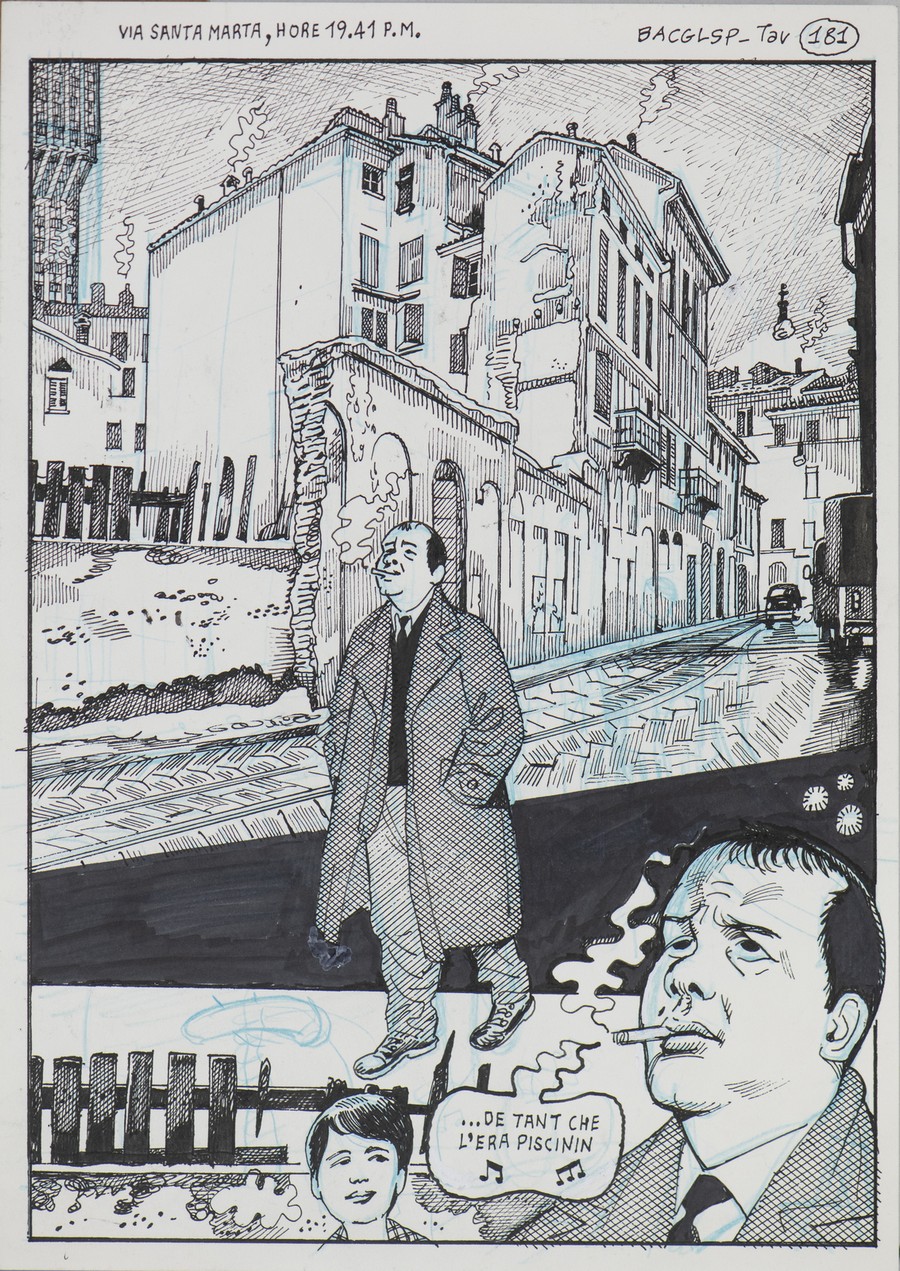 BACILIERI PAOLO (n. 1965) PIERO MANZONI BACGLSP(Basta a ciascuno giorno la sua pena)TAVOLA 181. 2023. disegno a matita e inchiostro di china. Cm 21,00 x 29,00. Una preziosa tavola dall'acclamata graphic novel che racconta la vita di Piero Manzoni opera di uno dei più amati e premiati fumettisti italiani, vincitore di numerosi riconoscimenti, tra i quali il Gran Guinigi di Lucca Comics e il Micheluzzi di Napoli Comicon. Pubblicata da Coconico Press.