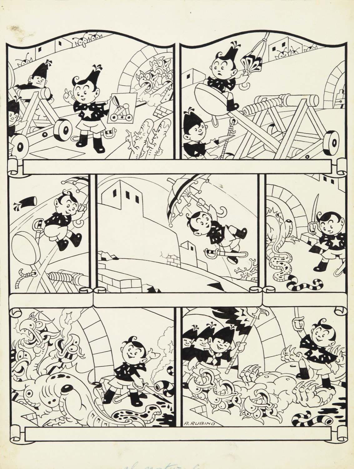 Tavola originale realizzata da Rubino per un episodio del suo Lio Balilla, pubblicata nella prima pagina del giornale Il Balilla tra il 1927 e 1929. Dopo diciannove anni al CdP, vero e proprio punto di riferimento nella redazione del giornale, Rubino decise di abbandonare la testata milanese per approdare al giornale di regime Il Balilla, spinto da "un assoluto bisogno di svolgere la mia attività in un campo meno apolitico e in modo più vivace e combattivo "; Rubino lavorerà al Balilla per soli tre anni, dal '27 al '29, il che rende di rarissima reperibilità le tavole di questo periodo. Fori di affissione al margine superiore. Firmata.