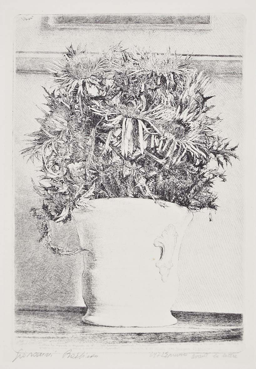 BARBISAN GIOVANNI Treviso 1914-1988 Vaso di cardi 1972 acquaforte es. prova ante litteram 50x35 cm firma in basso a sinistra data in basso a destra