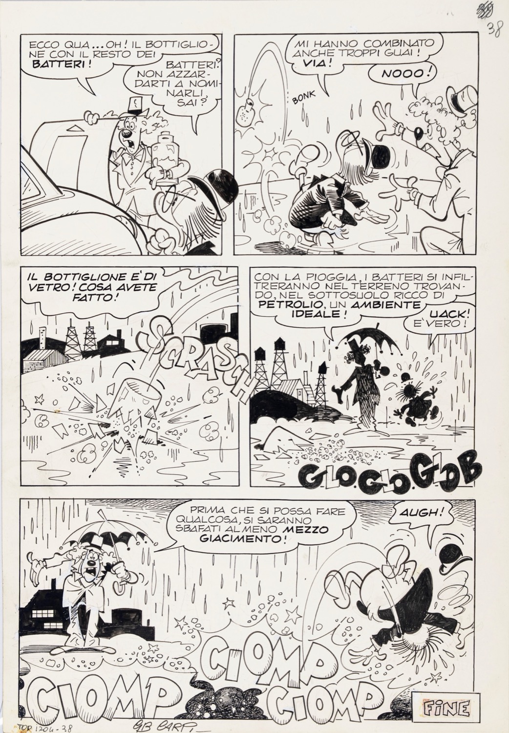 Tavola originale realizzata da Carpi per "Zio Paperone e i batteri mangiapetrolio", edita su Topolino n. 1704 a pag. 38 nel luglio 1988. Tavola contenuta nel suo folder originale (Walt Disney original comic art) con certificato di autenticità datato 12 aprile 1998. Sigillo intatto. Lieve piega orizzontale al margine inferiore. Firmata.