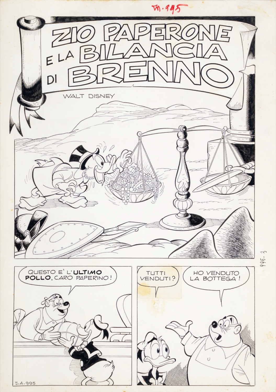 Title page originale realizzata da Chierchini per "Zio Paperone e la bilancia di Brenno", edita su Topolino n. 995 a pag. 1 nel dicembre 1974. Lievi pieghe.