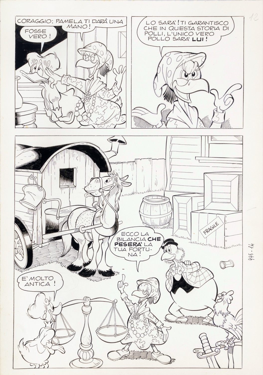 Tavola originale realizzata da Chierchini per "Zio Paperone e la bilancia di Brenno", edita su Topolino n. 995 a pag. 12 nel dicembre 1974. Lievi pieghe.