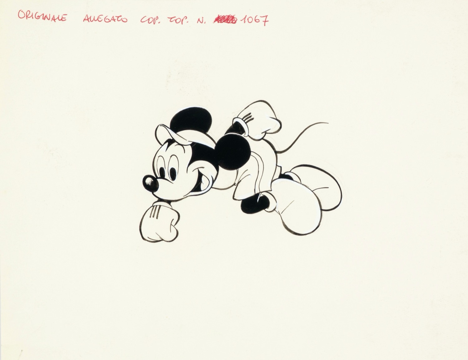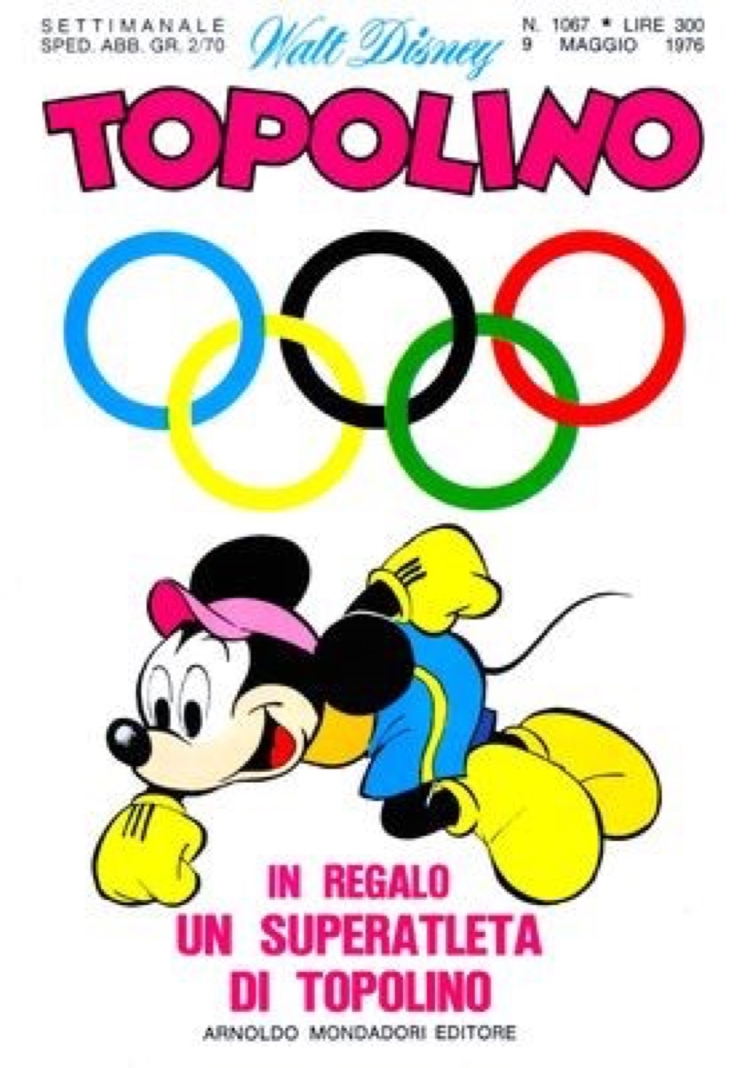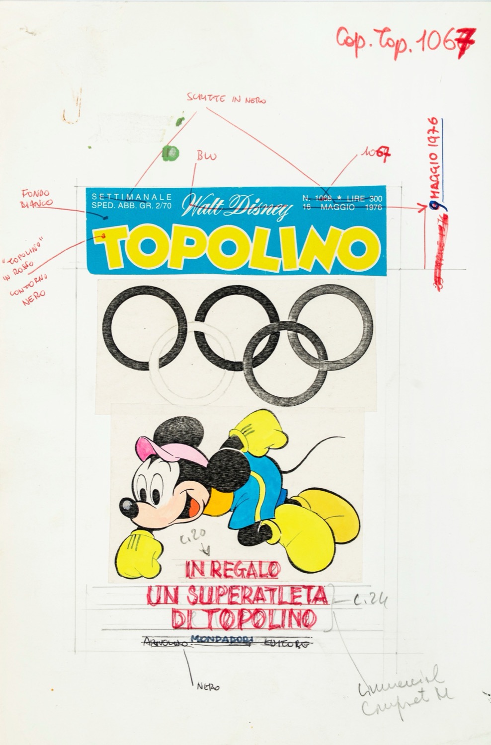 Originale di copertina realizzato da Rota per Topolino n. 1067, edito il 9 Maggio 1976. Un Topolino in posa atletica in occasione delle Olimpiadi di Montréal. Si allega la prova colore. Fori di affissione all'angolo inferiore sinistro, lievi pieghe agli angoli.
