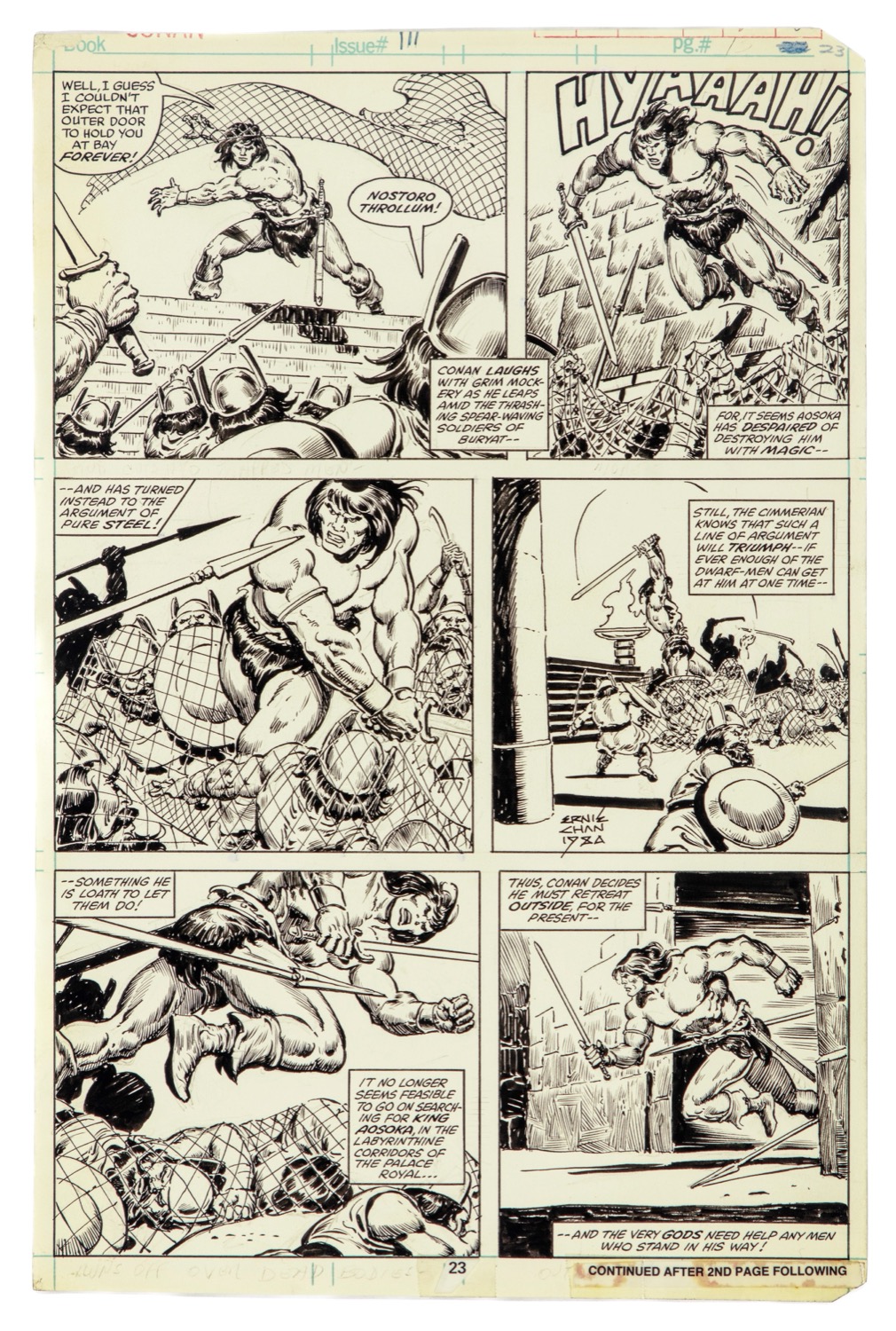 Tavola originale realizzata da Chan per "Cimmerian...Against a City!", edita su Conan the Barbarian n. 111 a pag. 23 dalla Marvel 1980. Piccola abrasione all'angolo superiore sinistro. Firmata e datata.