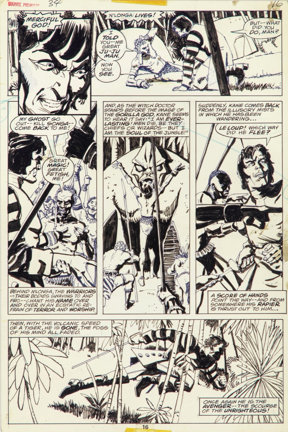 Tavola originale realizzata da Chaykin per "Fangs of the Gorilla God!", edita su Marvel Premiere n. 34 a pag. 16 dalla Marvel 1977. Lieve piega all'angolo superiore sinistro.