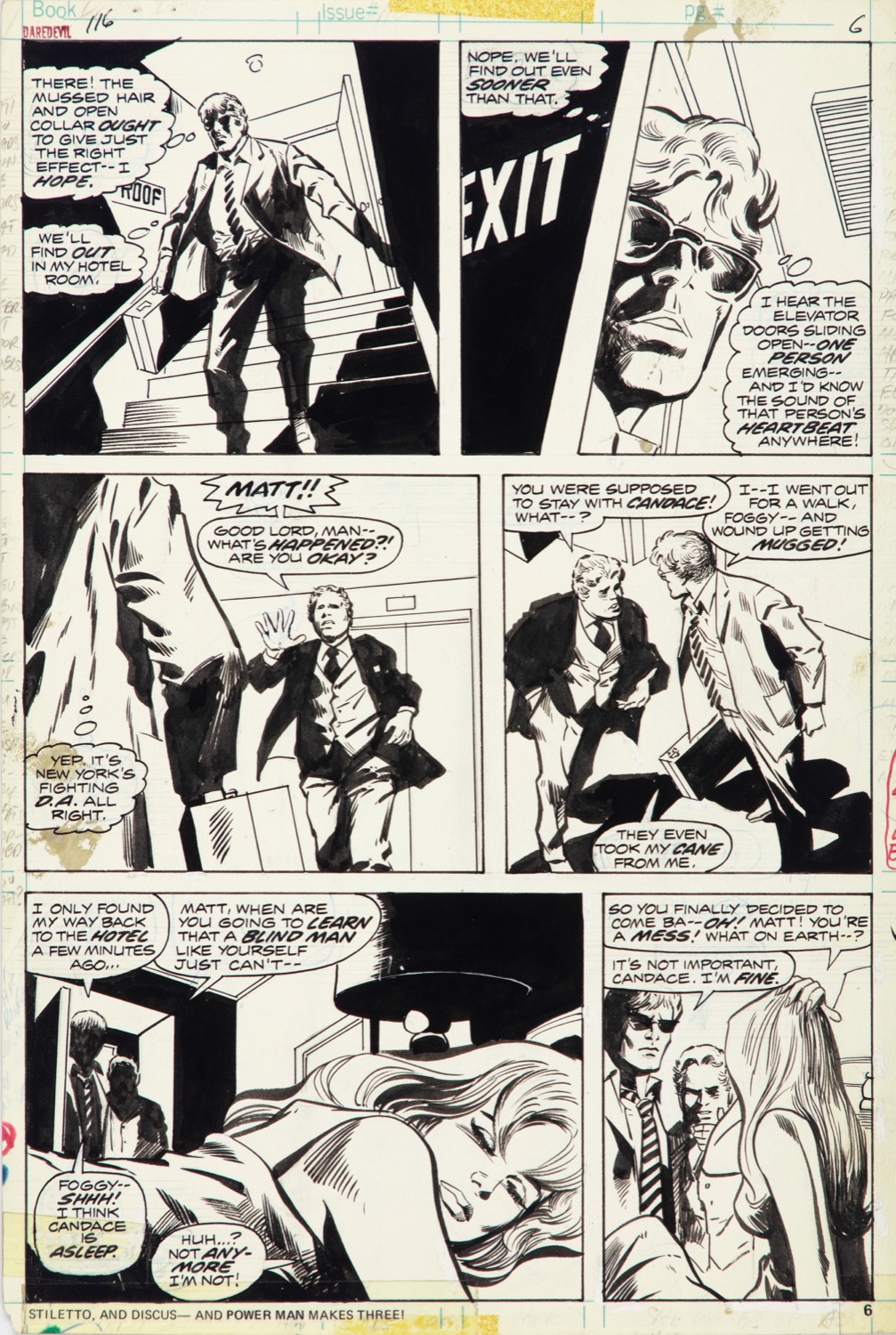 Tavola originale realizzata da Colan per "Two Flew Over the Owl's Nest!", edita su Daredevil n. 116 a pag. 6 dalla Marvel nel 1974. Piccola mancanza all'angolo inferiore sinistro, lieve piega all'angolo superiore destro.