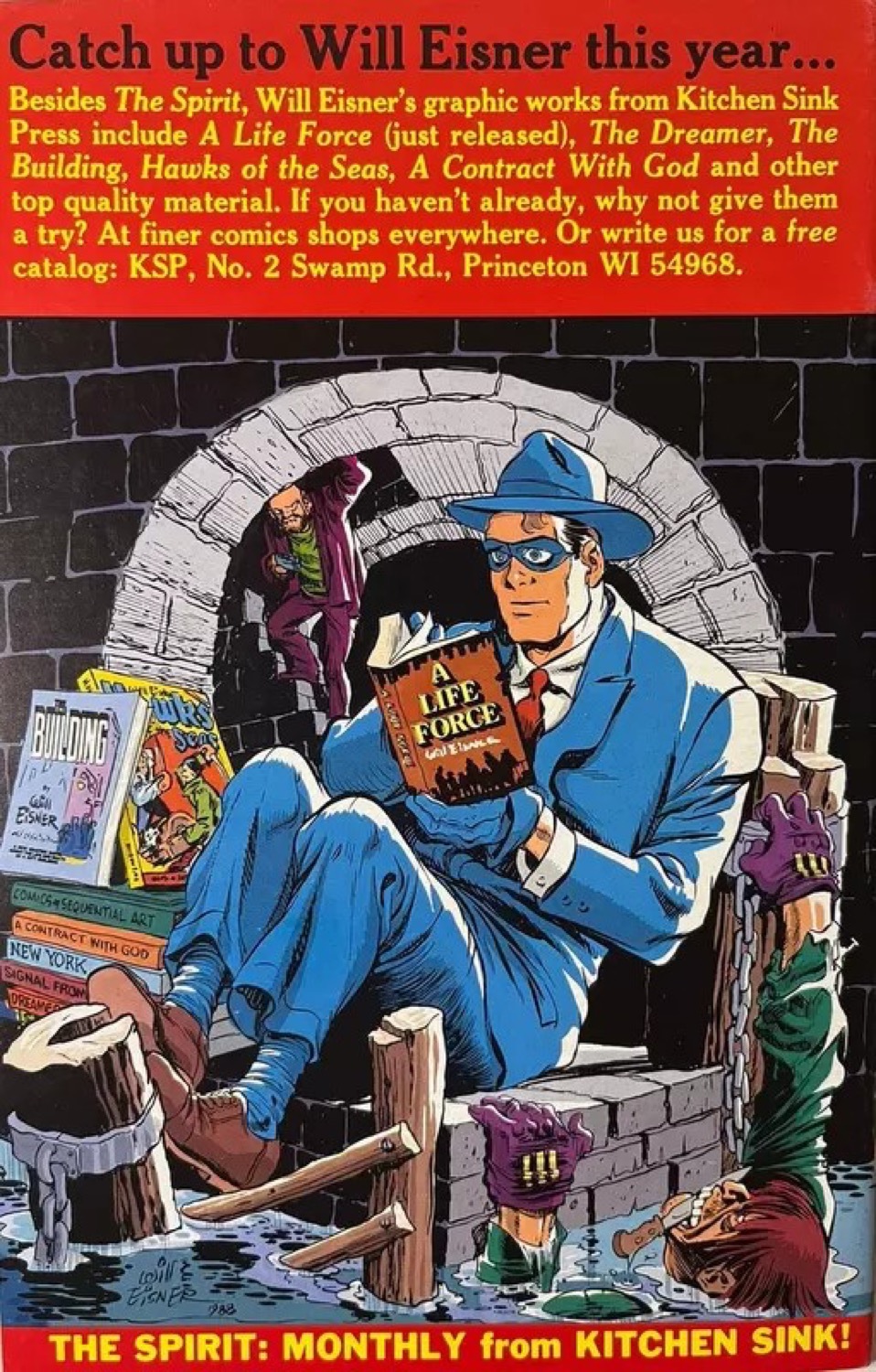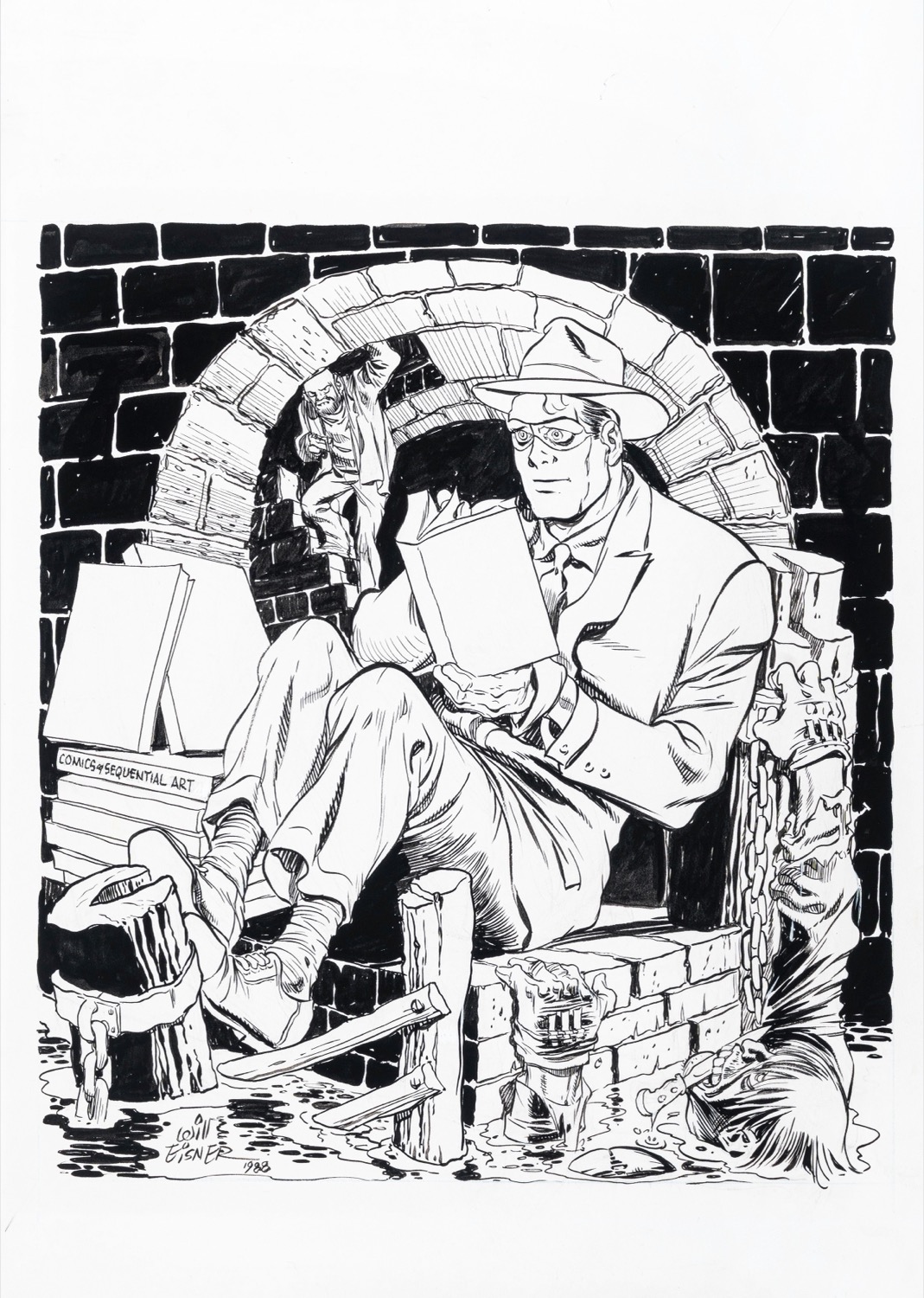 Originale di copertina realizzato da Eisner per il "Comic Shop News Collector's Guide" n. 1, edito dalla Paragraphics nel 1988. Pochi mesi più tardi l'opera è stata pubblicata nella quarta di copertina di "The Spirit" n. 49, edito dalla Kitchen Sink Press nel luglio del 1988. Successivamente l'opera è stata pubblicata sulla quarta di copertina del volume spagnolo "The Spirit: Histórias Clássicas de 1946" da Editorial Abril Jovem nel 1990. Nel 2015 l'opera è stata selezionata dalla Will & Ann Eisner Family Foundation per essere utilizzata come immagine promozionale della "Will Eisner Week 2015", ricorrenza annuale che quell'anno festeggiò il 75th anniversario dalla creazione di "The Spirit" in più di 50 città nel mondo. Tra le immagini più iconiche e più riprodotte dello Spirit di Eisner, un pezzo da museo. Firmato e datato.