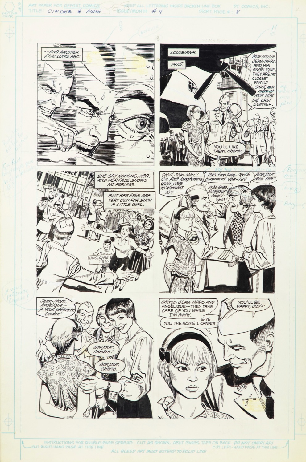 Tavola originale realizzata da García-López per la miniserie "Cinder and Ashe" n. 4, edita a pag. 8 dalla DC nel 1988. La storia segue i due soci di una società di investigazioni private; Jacob Ashe è un veterano della guerra del Vietnam, mentre Cinder DuBois è figlia di un soldato afroamericano e di una donna vietnamita. Cinder e Ashe vengono assunti da un contadino dell'Iowa per ritrovare la figlia rapita. Nel corso delle indagini, alcuni flashback rivelano come Cinder e Ashe si sono conosciuti e come si è sviluppata la loro relazione.