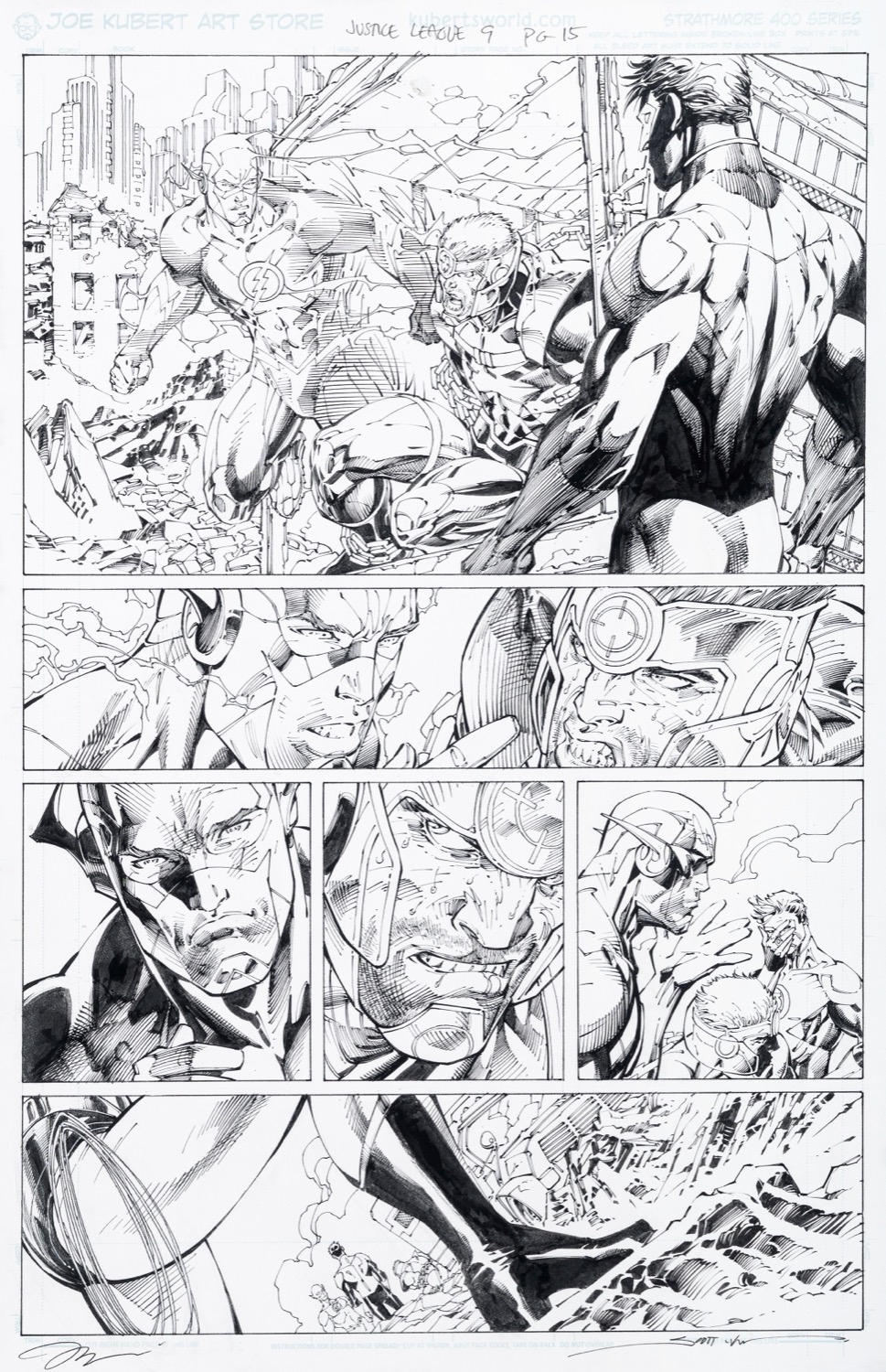 Tavola originale realizzata da Lee per "The Villain's Journey", edita su Justice League n. 9 a pag. 15 dalla DC nel 2012. Chine di Scott Williams. Firmata da entrambi gli autori.