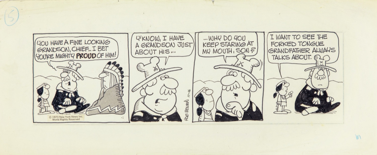 Striscia giornaliera del 16/11/1973 per "Catfish". Strip nata nel 1973 che narra le gesta di Catfish, quella che dovrebbe essere la più abile guida del selvaggio west, di fatto capace di perdersi in un bicchier d'acqua. Pieghe ai margini. Firmata e datata.