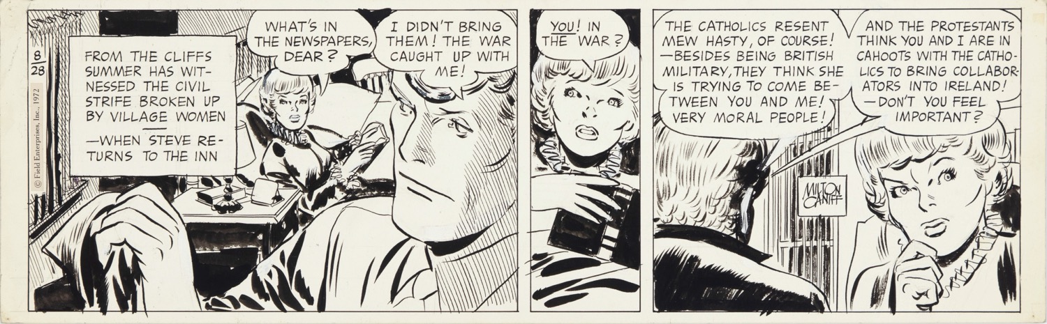 Striscia giornaliera del 28/08/1972 per "Steve Canyon". Fori di affissione agli angoli. Firmata e datata.