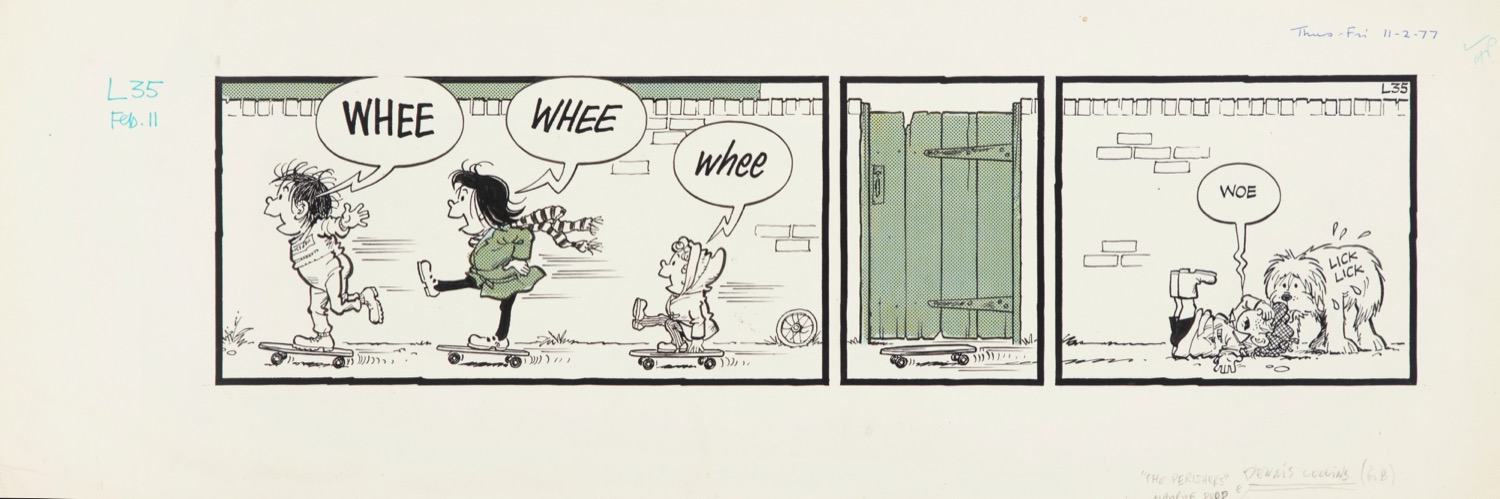 Striscia giornaliera del 11/02/1977 per "The Perishers". Lievi pieghe agli angoli.