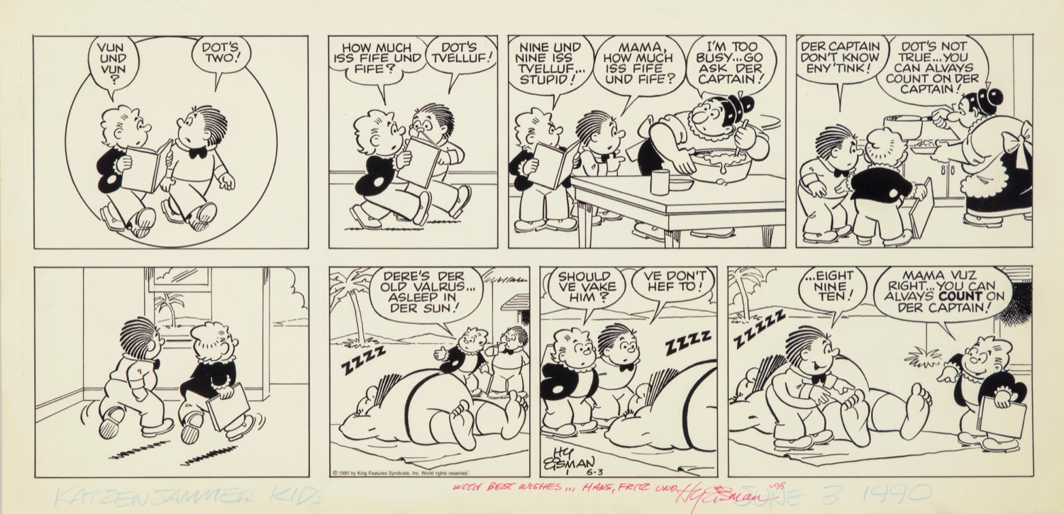 Striscia giornaliera del 03/06/1990 per "The Katzenjammer Kids". Firmata, datata e dedicata.