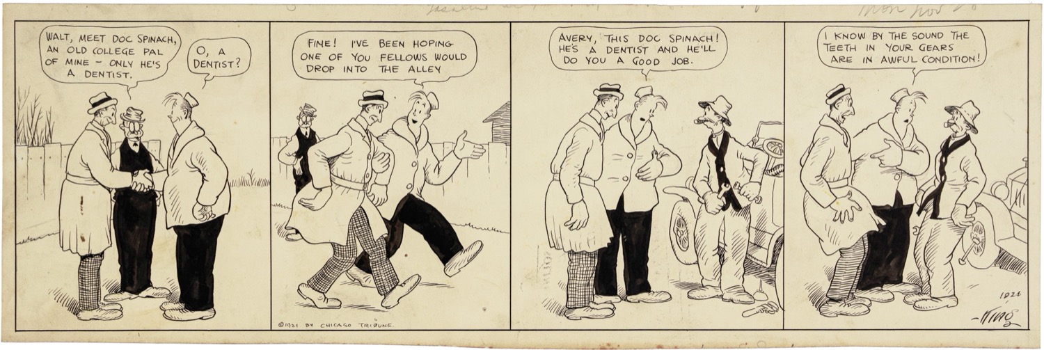 Striscia giornaliera del 28/11/1921 per "Gasoline Alley". Questo episodio intitolato "May Need a Set of False Ones", in cui vediamo Walt, Avery e Doc, risale a pochi mesi dopo che Walt scoprì per la prima volta il piccolo Skeezix abbandonato sulla soglia di casa, il 14 febbraio 1921. Di grande rarità. Firmata e datata.