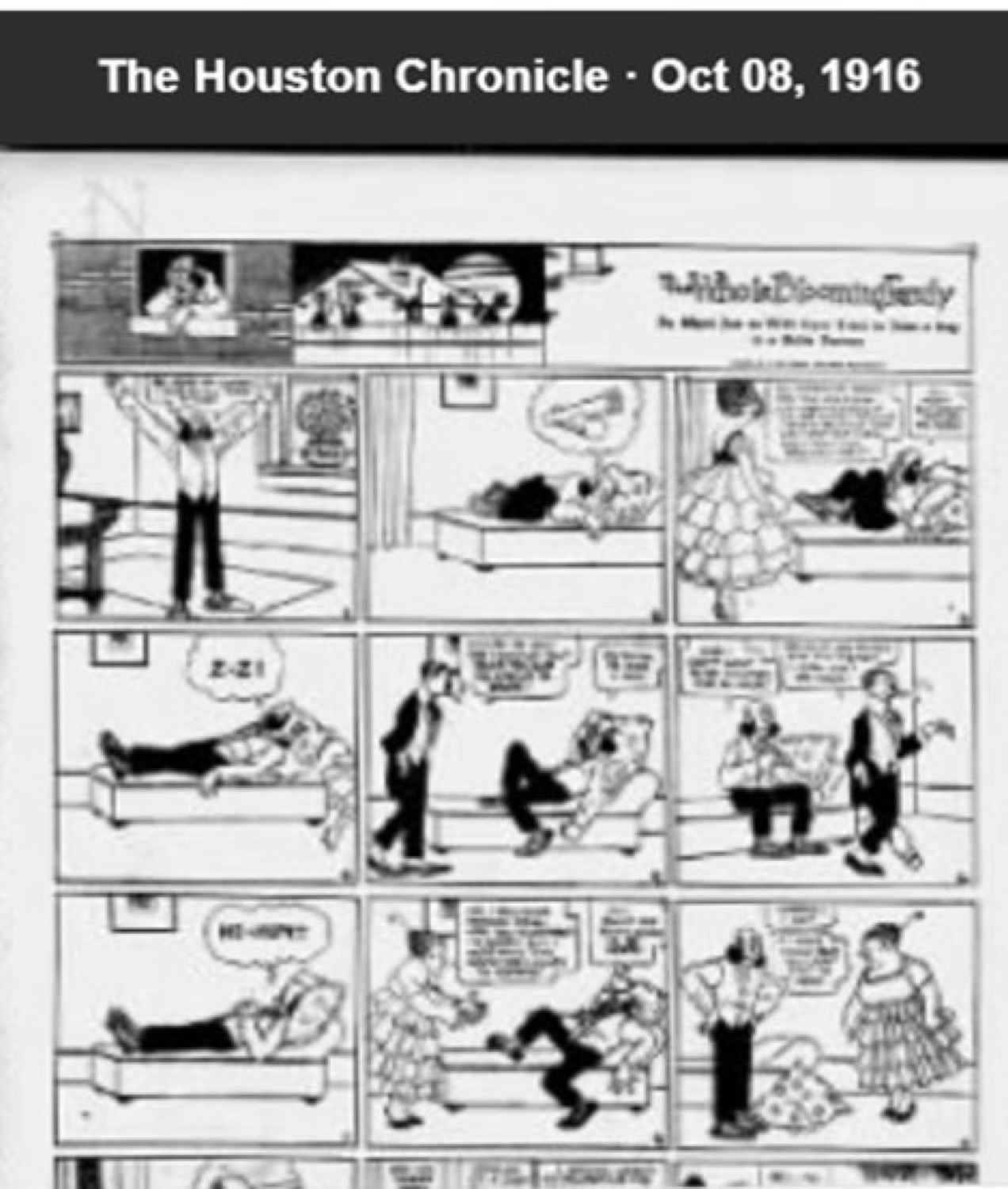 Tavola domenicale del 08/10/1916 per "The Whole Blooming Family". Nel 13 febbraio 1916 McManus decise di interrompere dopo un decennio la sua strip "Their Only Child" dando così vita a una nuova serie intitolata "The Whole Blooming Family"; portando i lettori nella vita quotidiana di una famiglia il cui capofamiglia (uomo pacifico e gioviale) è un indaffarato uomo d'affari, la moglie una popolana, la figlia è una giovane viziata e alla moda, un figlio ozioso di nome Oswald e due bambini proni al capriccio completano il quadro. La serie fu interrotta dopo soli otto mesi, il 22 ottobre 1916, a favore della nuova serie "Rosie's Beau". La brevissima vita di questa strip ne fanno in assoluto una delle più rare mai realizzate da McManus, non si conoscono altri esemplari apparsi sul mercato negli ultimi anni. Su due pannelli. Firmata.