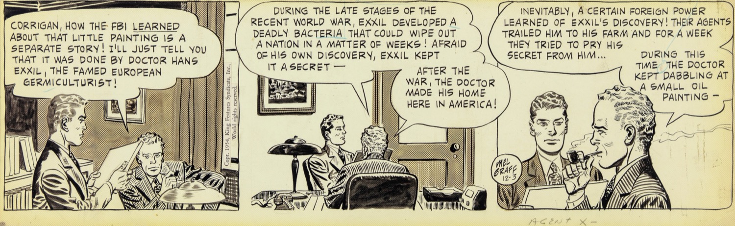 Striscia giornaliera del 03/12/1954 per "Secret Agent X-9". Lieve piega all'angolo inferiore sinistro. Firmata e datata.