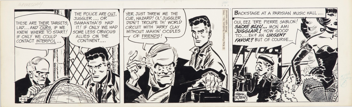 Striscia giornaliera del 06/04/1966 per "Johnny Hazard". Creata dal genio di Robbins e apparsa per la prima volta sui quotidiani statunitensi il 5 giugno 1944, il giorno prima dello sbarco in Normandia, Johnny Hazard vede protagonista un pilota americano. Con la fine della guerra ormai imminente, le storie di questo eroe tutto d‘un pezzo si focalizzano sulla nuova "minaccia rossa". Robbins riesce con abilità a caratterizzare nel dettaglio ogni personaggio e grazie al suo talentuoso tratto, che risente fortemente dell‘influsso caniffiano, ci fa apprezzare ogni singola striscia. Firmata e datata.