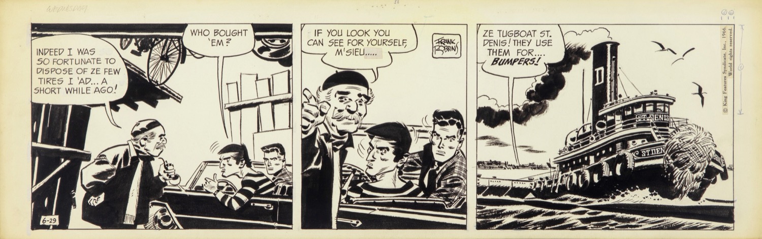 Striscia giornaliera del 29/06/1966 per "Johnny Hazard". Creata dal genio di Robbins e apparsa per la prima volta sui quotidiani statunitensi il 5 giugno 1944, il giorno prima dello sbarco in Normandia, Johnny Hazard vede protagonista un pilota americano. Con la fine della guerra ormai imminente, le storie di questo eroe tutto d‘un pezzo si focalizzano sulla nuova "minaccia rossa". Robbins riesce con abilità a caratterizzare nel dettaglio ogni personaggio e grazie al suo talentuoso tratto, che risente fortemente dell‘influsso caniffiano, ci fa apprezzare ogni singola striscia. Fori di affissione al margine superiore. Firmata e datata.