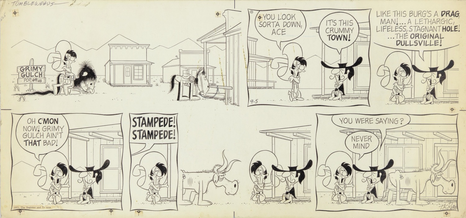 Tavola domenicale del 05/09/1971 per "Tumbleweeds". Popolare striscia comica creata da Ryan nel 1965 e ambientata nel vecchio west. Lievi pieghe agli angoli. Firmata e datata.