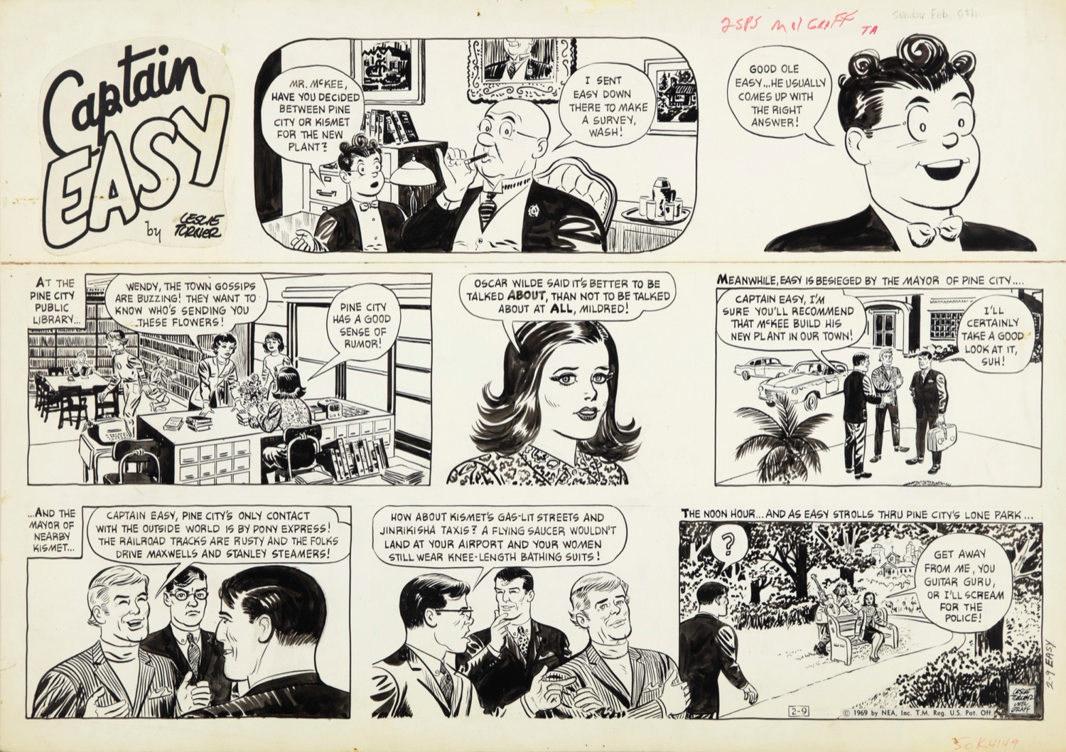 Tavola domenicale del 09/02/1969 per "Captain Easy". Piccolo strappo al margine sinistro.
