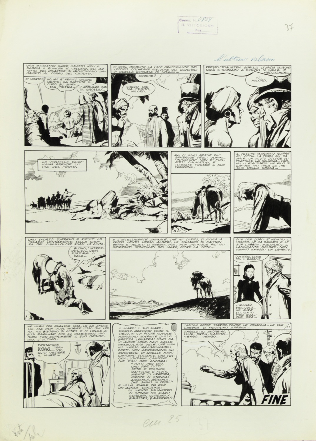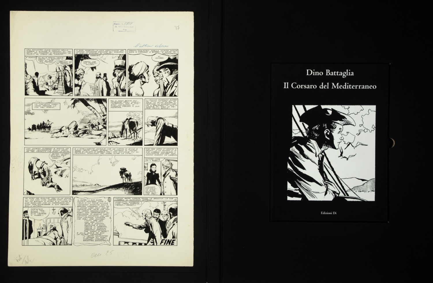 Tavola originale realizzata da Battaglia per la pag. 37 de "Il corsaro del Mediterraneo", edita per la prima volta sul settimanale Il Vittorioso nel 1958. Una delle opere più emblematiche eseguite da Battaglia nella prima fase della sua carriera: pur dovendo infatti rispettare le imposizioni stilistiche dell'editore, il maestro veneziano muove qui i suoi primi passi verso un tratto più maturo e introspettivo. Si presenta la tavola all'interno del cofanetto editoriale, realizzato nel 2006 in occasione della ristampa del volume da parte delle Edizioni Di.