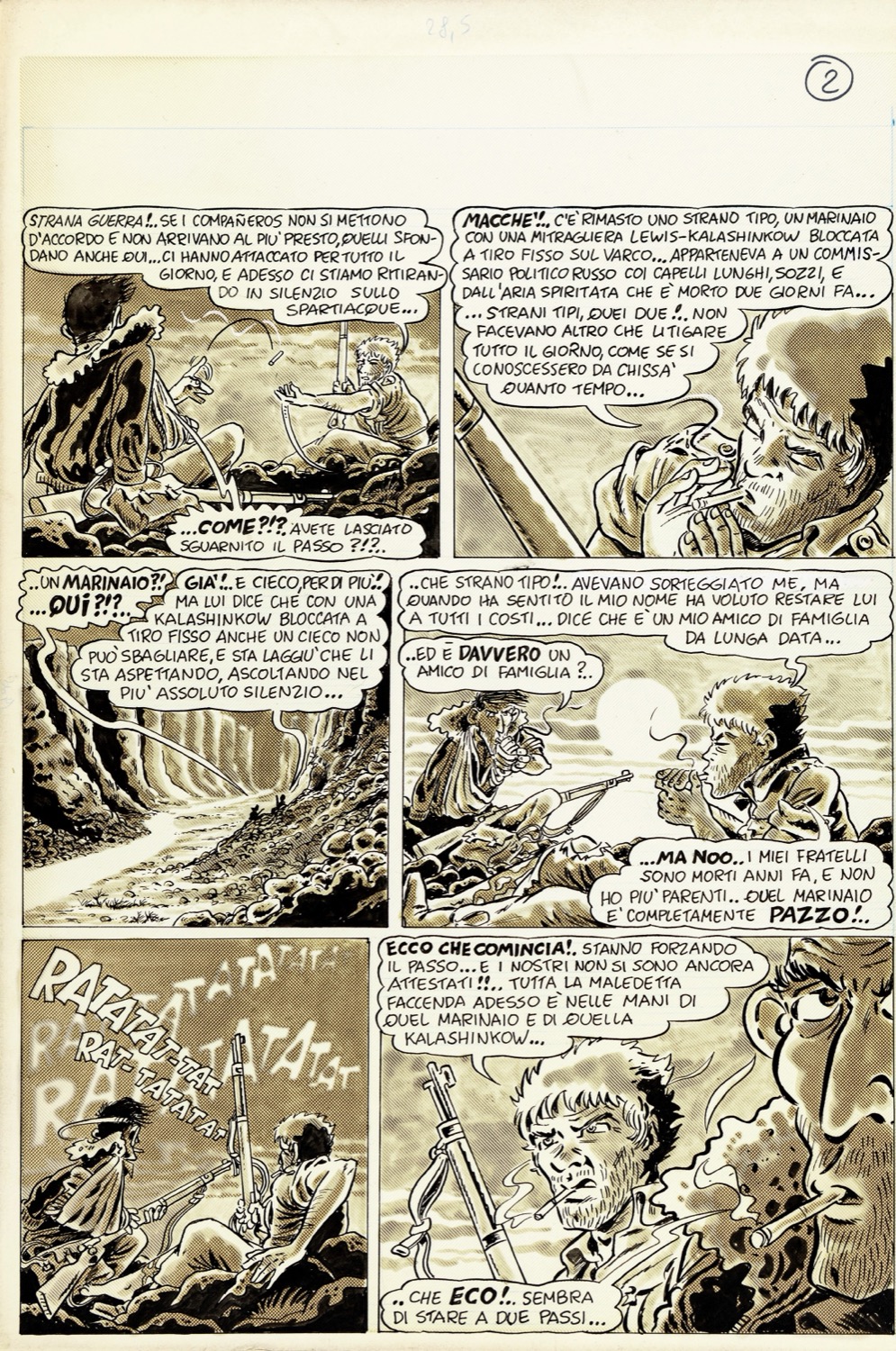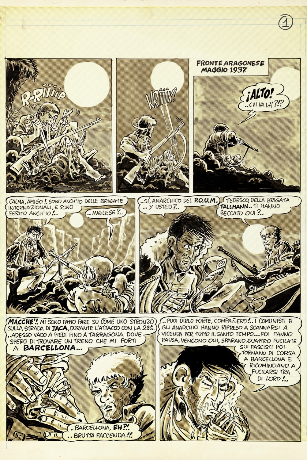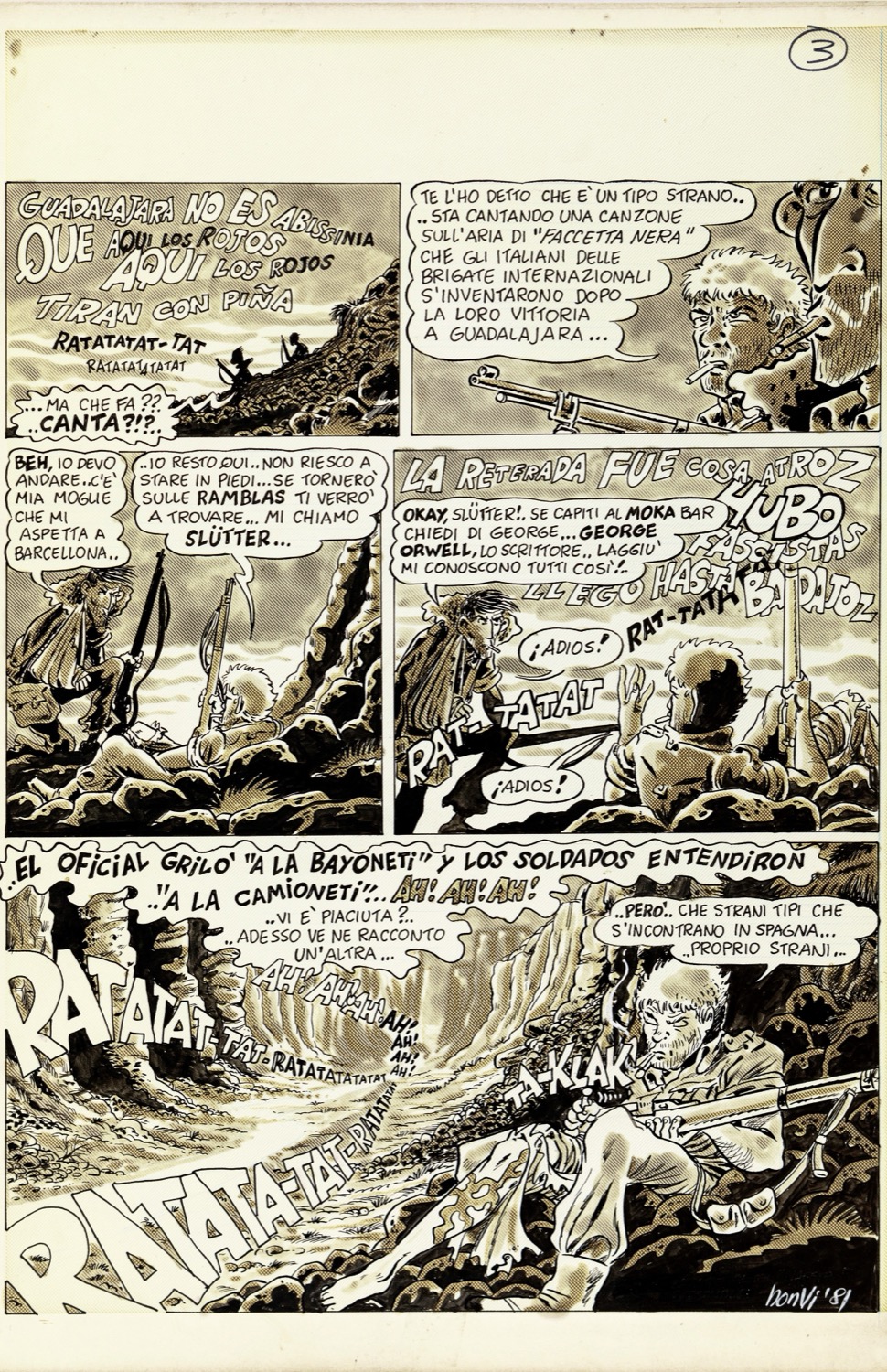 Storia completa composta da 3 tavole originali realizzate da Bonvi come omaggio a Pratt e al suo Corto Maltese, pubblicata per la prima volta sul volume "Dedicated to Corto Maltese" curato da Vincenzo Mollica e edito dagli Editori del Grifo nel 1981. Nel 1967 con "Una ballata del mare salato" Pratt suggella la nascita del suo immortale Corto Maltese, ma al contempo decide di omaggiare l‘amico fraterno Bonvi (sarà suo testimone di nozze) dando all‘ufficiale della marina tedesca Christian Slutter le fattezza dell‘amico bolognese; quattordici anni dopo Bonvi decide di ricambiare il favore rappresentando gli ultimi attimi di vita di Corto in un commovente quanto poetico scambio di battute tra due volontari internazionali sul fronte aragonese della guerra civile spagnola: George Orwell e il fratello di Slutter (fucilato nella Ballata). Firmata e datata all‘ultima pagina.