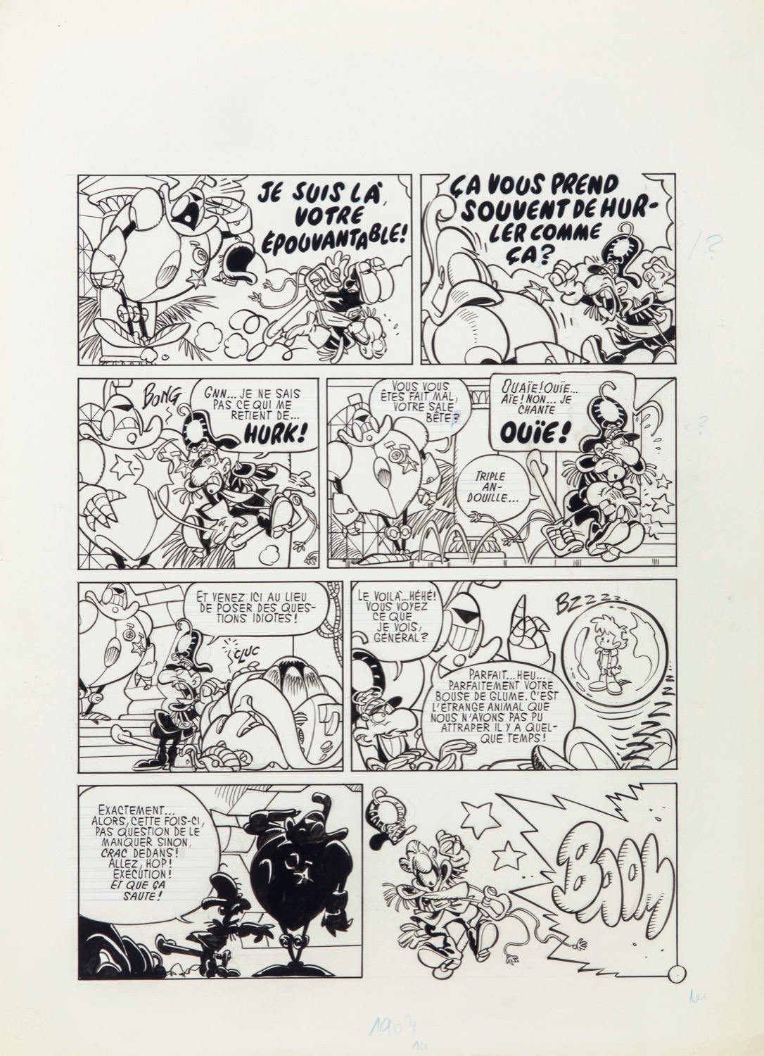 Tavola originale realizzata da Cavazzano per un episodio della serie Timoty Titan pubblicata per la prima volta in Francia su Pif Gadget alla fine degli anni '80. Lievi pieghe e piccole mancanze agli angoli.