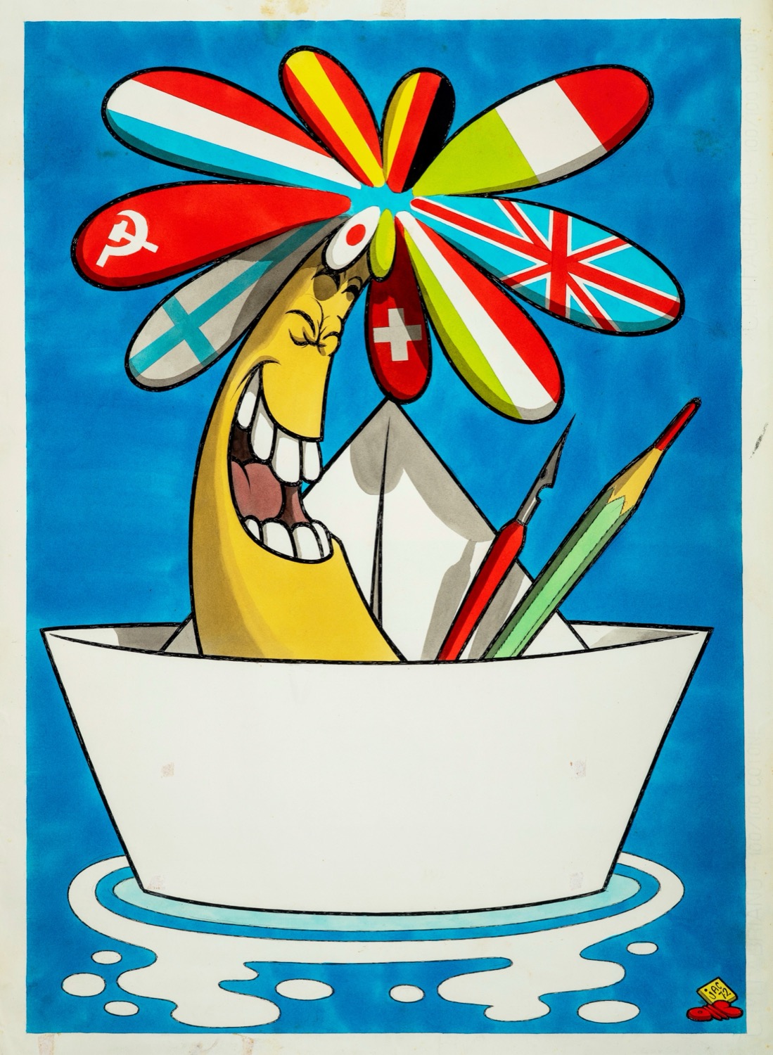 Illustrazione originale di grande formato realizzata da Jacovitti per il manifesto ufficiale del XXV Salone Internazionale dell'Umorismo tenutosi a Bordighera nel Luglio e Agosto del 1972. Firmata e datata con lisca di pesce.