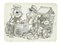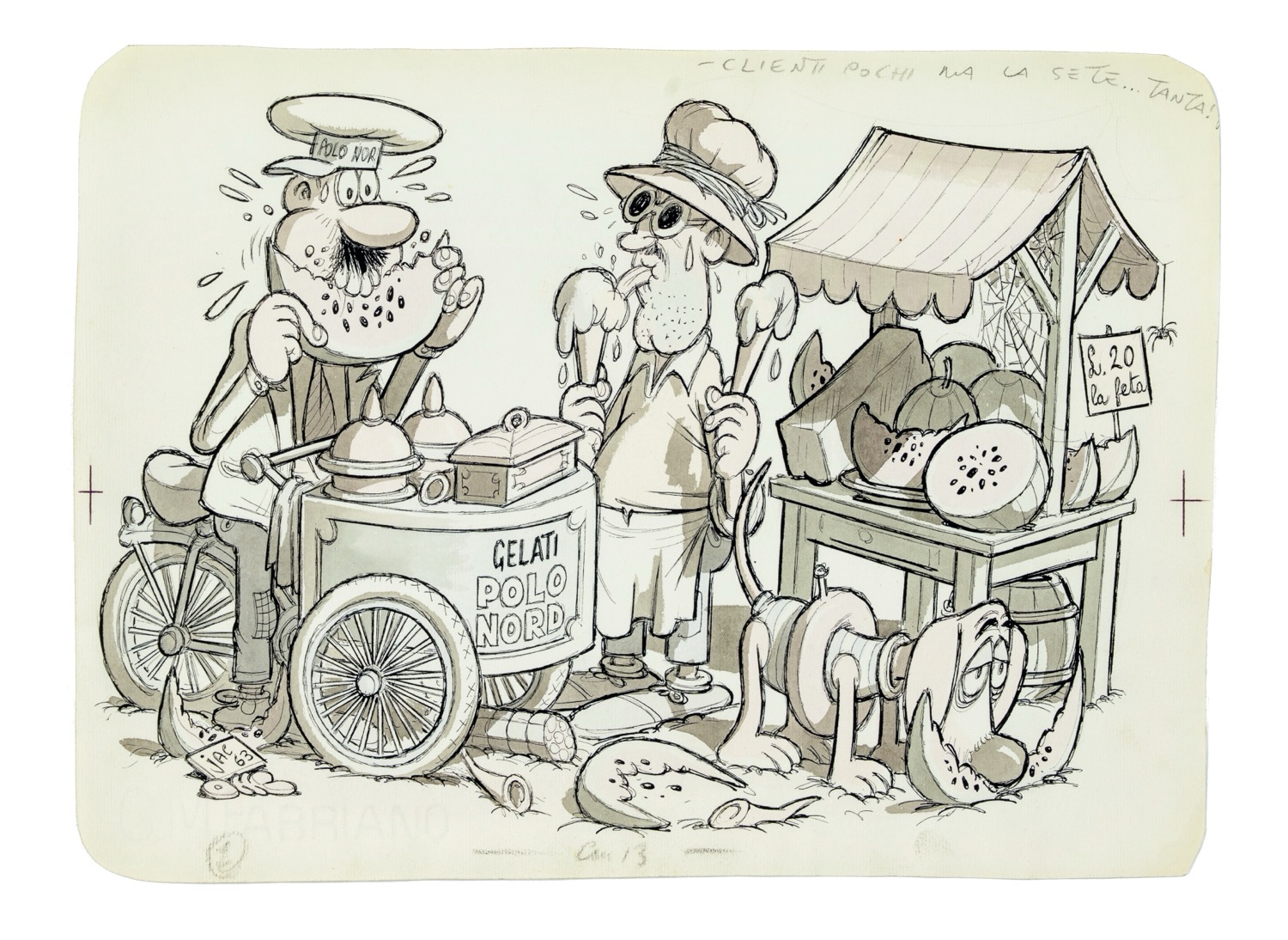 Illustrazione originale realizzata da Jacovitti per il paginone domenicale del quotidiano Il Giorno. " Clienti pochi, ma la sete…tanta! " Acquerellata al retro. Firmata con lisca di pesce e datata.
