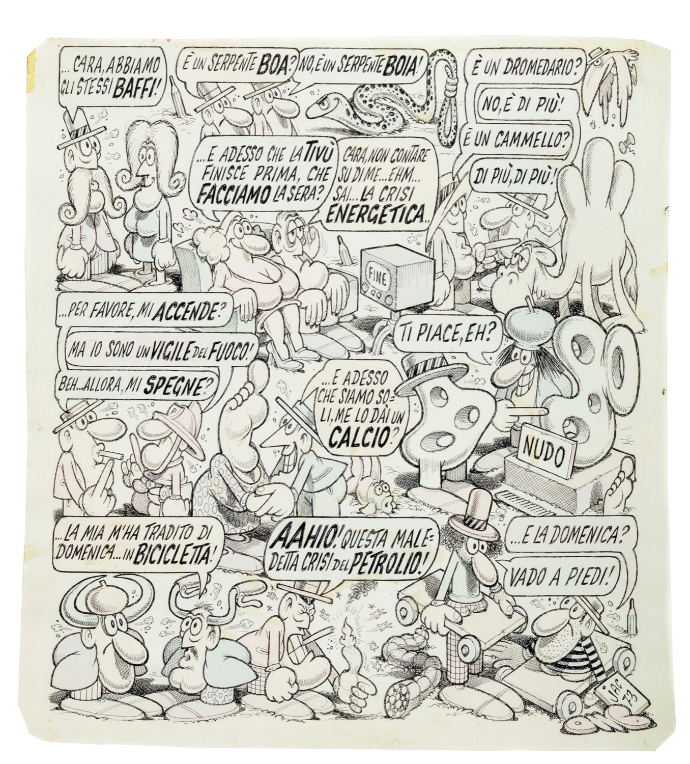 Illustrazione originale realizzata da Jacovitti e pubblicata sul quotidiano milanese Il Giorno nel 1973. Jacovitti è famoso per le sue illustrazioni panoramiche piene di personaggi grotteschi e irriverenti, che caratterizzano anche questa tavola costellata di ossa, matite e salami. Acquerellata al retro. Firmata con lisca di pese e datata.