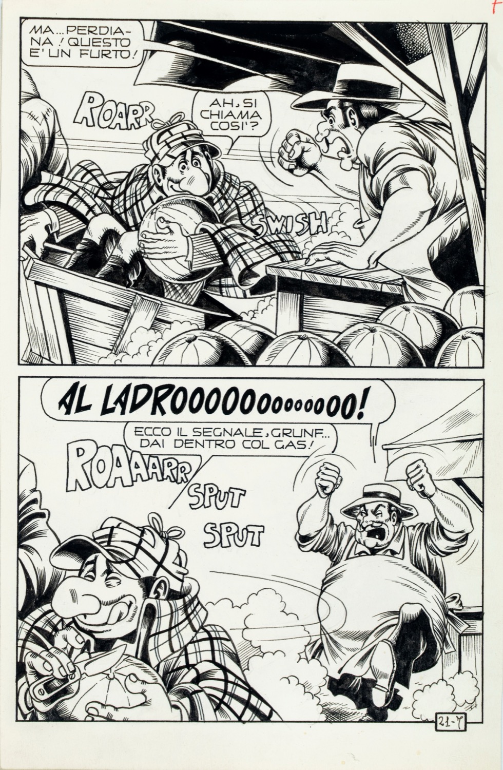 Lotto composto da 3 tavole originali realizzate da Magnus per "Bombafobia", edite alle pagg. 6 - 7 - 8 dalla Editoriale Corno nel 1971. Storica sequenza del furto dell'anguria rimasta nei cuori di tutti gli appassionati di Alan Ford.