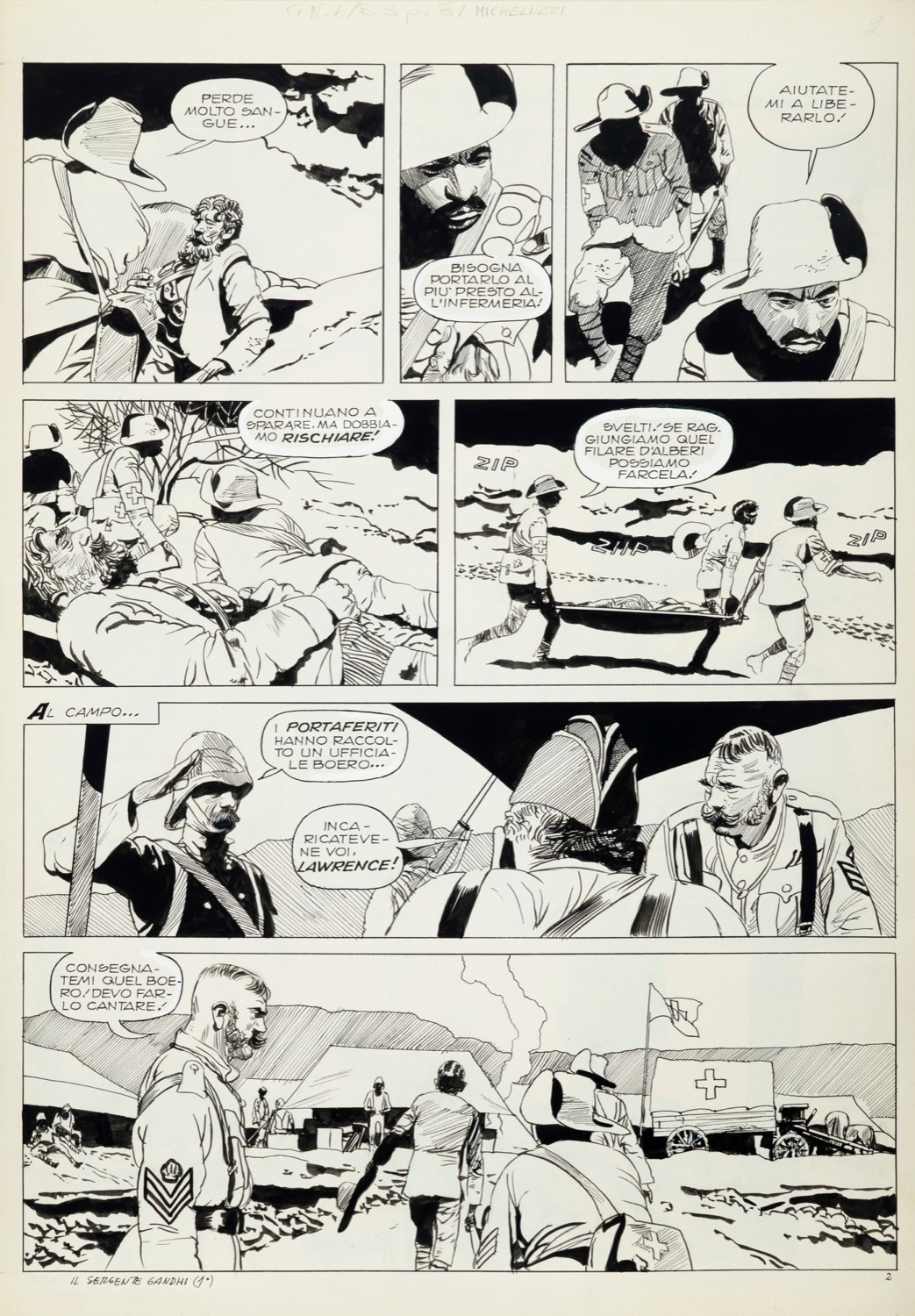 Tavola originale realizzata da Micheluzzi per "Il sergente Gandhi", pubblicata per la prima volta su Il Giornalino n. 6 a pag. 2 nel 1983.