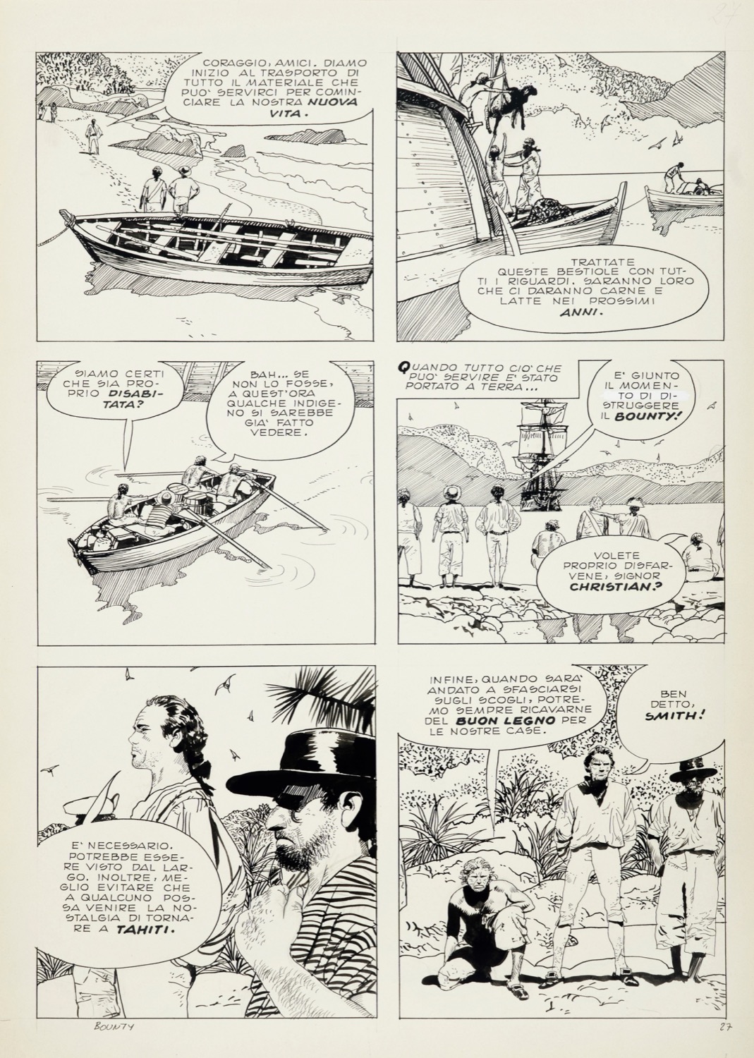 Tavola originale realizzata da Micheluzzi per "Gli ammutinati del Bounty", pubblicata per la prima volta su Il Giornalino n. 19 a pag. 27 nel 1984.