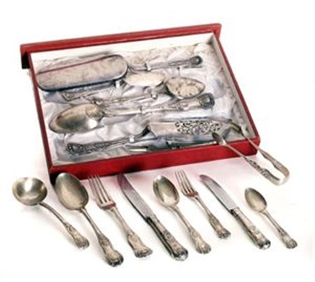 SERVIZIO DI POSATE IN ARGENTO Servizio di posate in argento Londra. Periodo seconda metà del XIX sec. composto da: 12 cucchiai, 12 forchette, 6 forchette da dessert, 6 coltelli, 6 coltelli da dessert, 6 cucchiaini, 7 posate da portata e 1 pinza ghiaccio per un totale di 57 pz. Totale complessivo gr. 4.200. Dentro scatola di epoca posteriore. London silver cutlery. Period second half of the nineteenth century. consisting of: 12 spoons, 12 forks, 6 dessert forks, 6 knives, 6 dessert knives, 6 spoons, 7serving utensils, and 1 clip ice for a total of 57 pcs. Grand total grams. 4,200. Inside the box a later date.