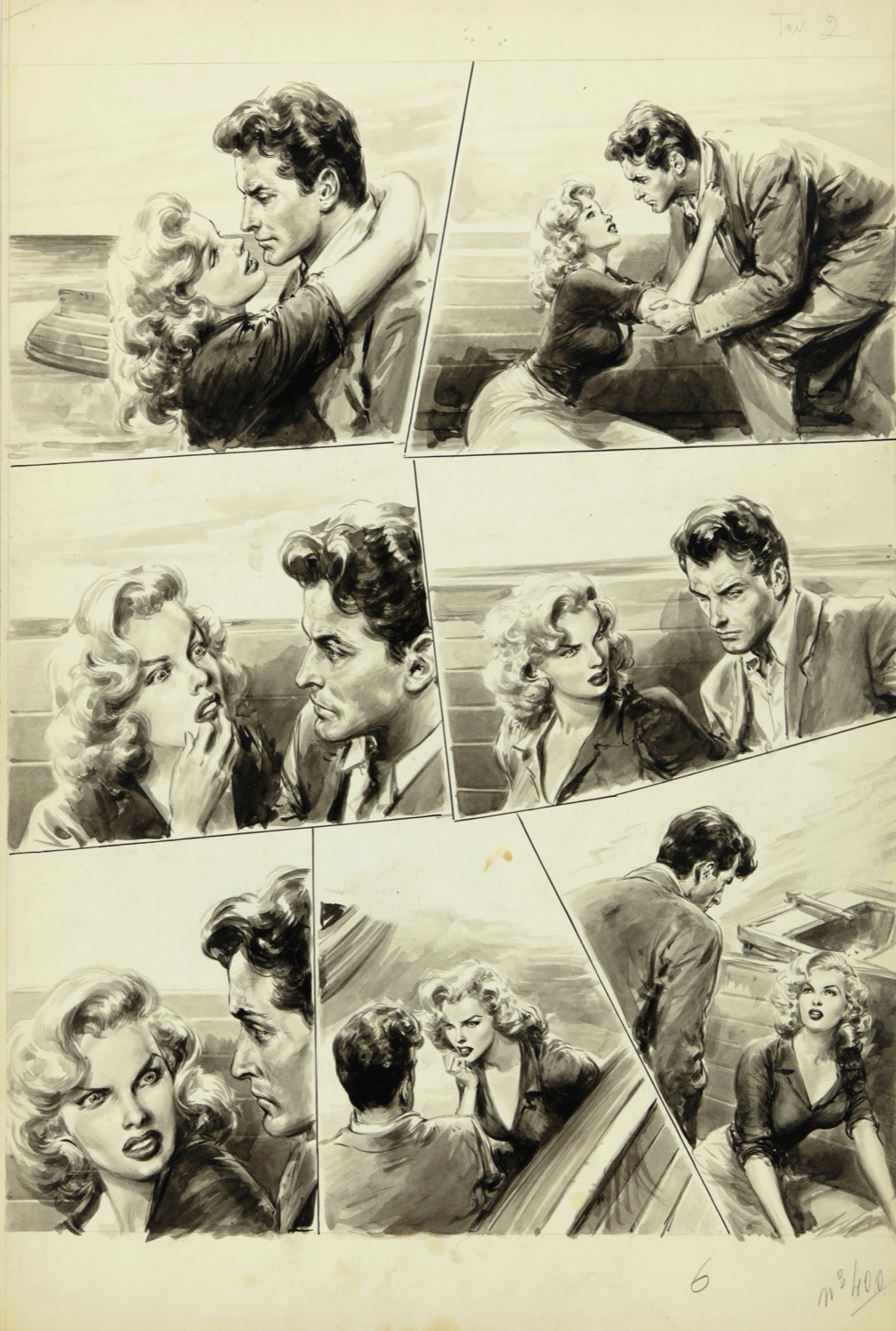 Tavola originale realizzata da Molino per la celebre storia "Le sorelle innamorate", edita a puntate sulla rivista Grand Hotel nei primi anni '50. Un Molino al suo massimo, capace di donare ai protagonisti le sembianze di un giovane Tony Curtis e di una sensuale Marylin Monroe. Fori di affissione al margine superiore.