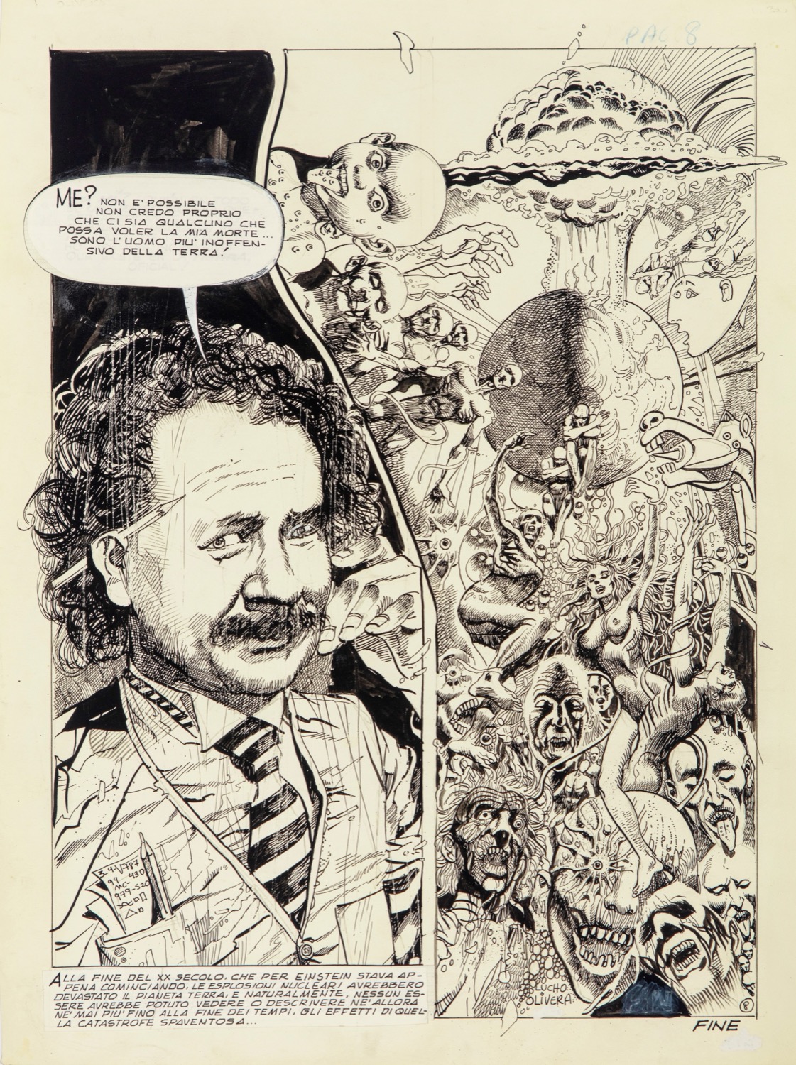 Tavola originale conclusiva per la storia "Uccidete Einstein!", edita per la prima volta in Italia sulla rivista L'Eternauta n. 37 dalle Edizioni Produzione Cartoons nel 1985. Firmata.
