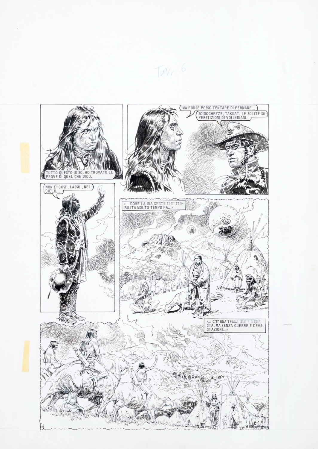 Tavola originale realizzata da Serpieri per la pag. 6 di "Takuat", storia edita per la prima volta sulle pagine di Lanciostory n. 50 nel 1979. Edito successivamente in Francia su Pilote n. 921 dalla Dargaud Editeur nel 1988. Lievi pieghe agli angoli superiori.