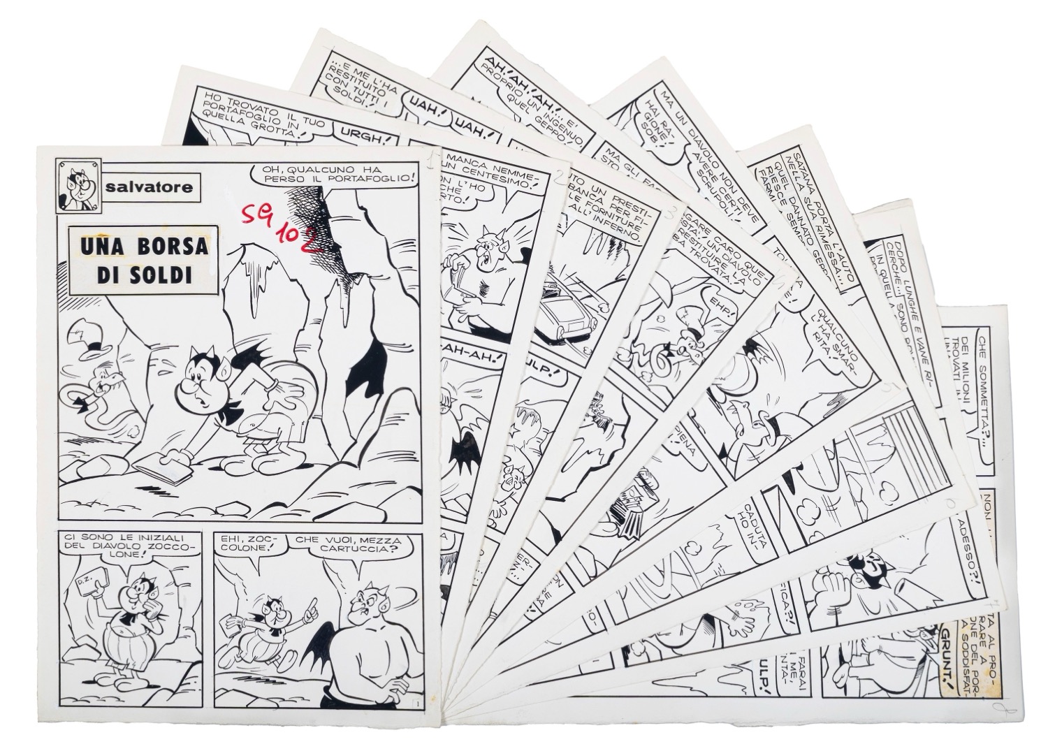 Storia completa composta da 8 tavole originali realizzate da Dossi per "Una borsa di soldi", avventura del buon diavolo Geppo pubblicata su Geppo n. 102 dalla Bianconi negli anni '70. Firmata in ogni pagina al retro.