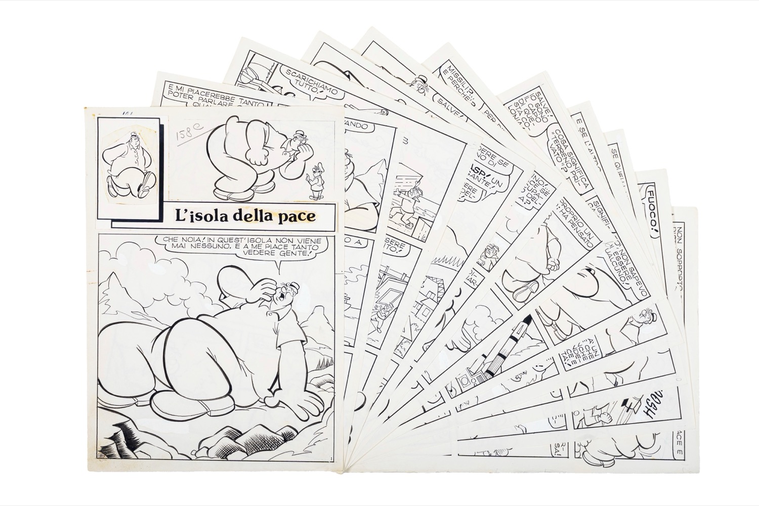Storia completa composta da 12 tavole originali realizzate da Dossi per "L'isola della pace", avventura del gigante Grissino pubblicata su Braccio di Ferro n. 186 dalla Bianconi negli anni '70. Lievi pieghe e piccoli strappi ai margini. Firmata in ogni pa
