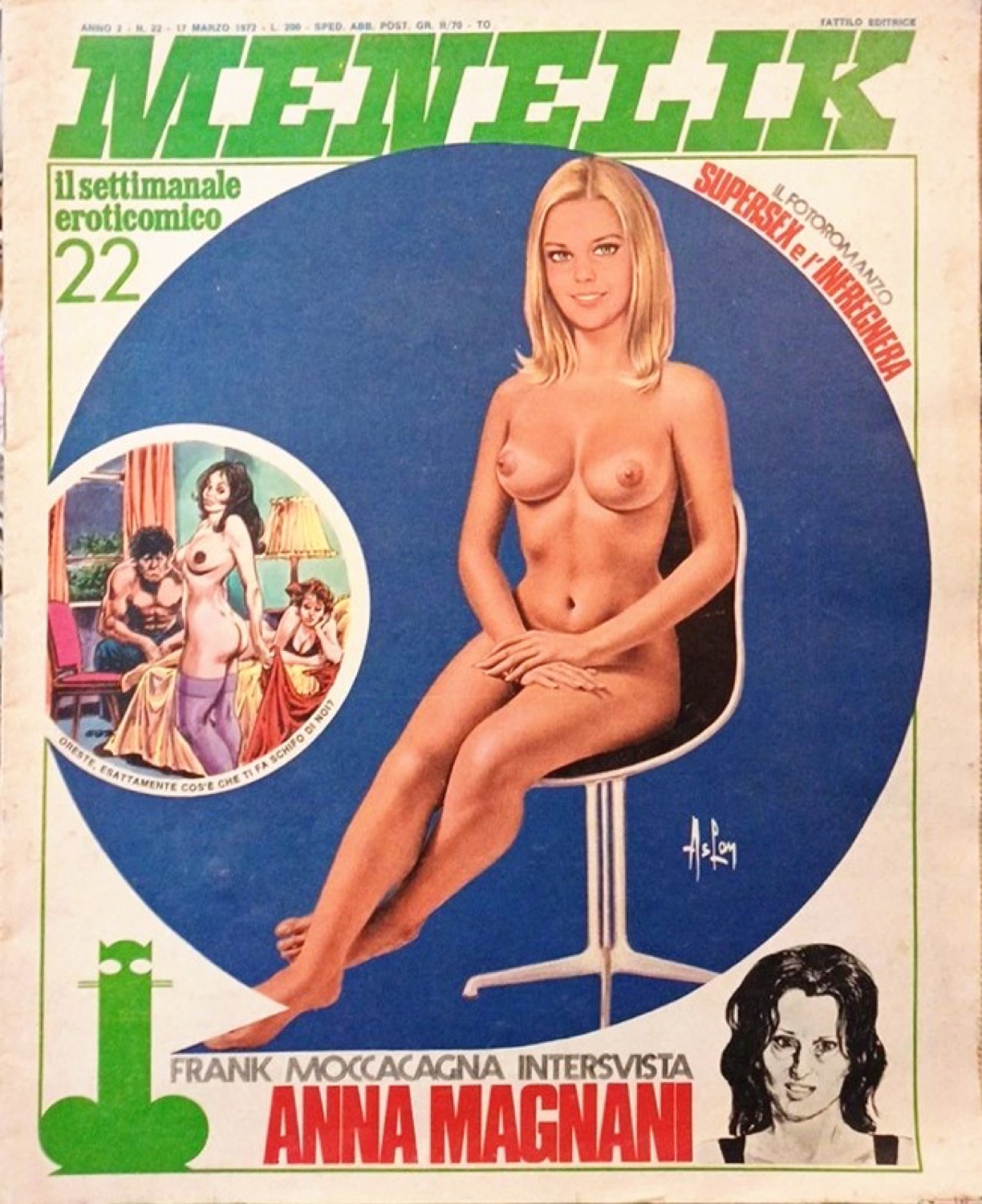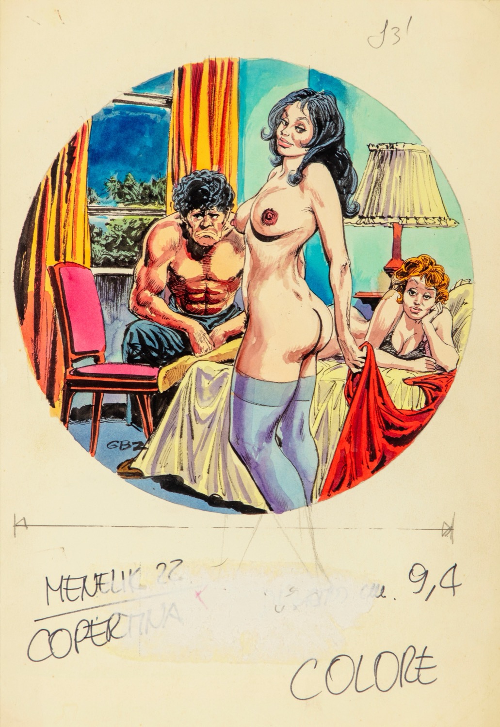 Illustrazione originale realizzata da Buzzelli per la copertina del settimanale eroticomico Menelik n. 22, edito dalla Tattilo Editrice nel 1972. Fori di affissione all'angolo superiore sinistro. Firmata.