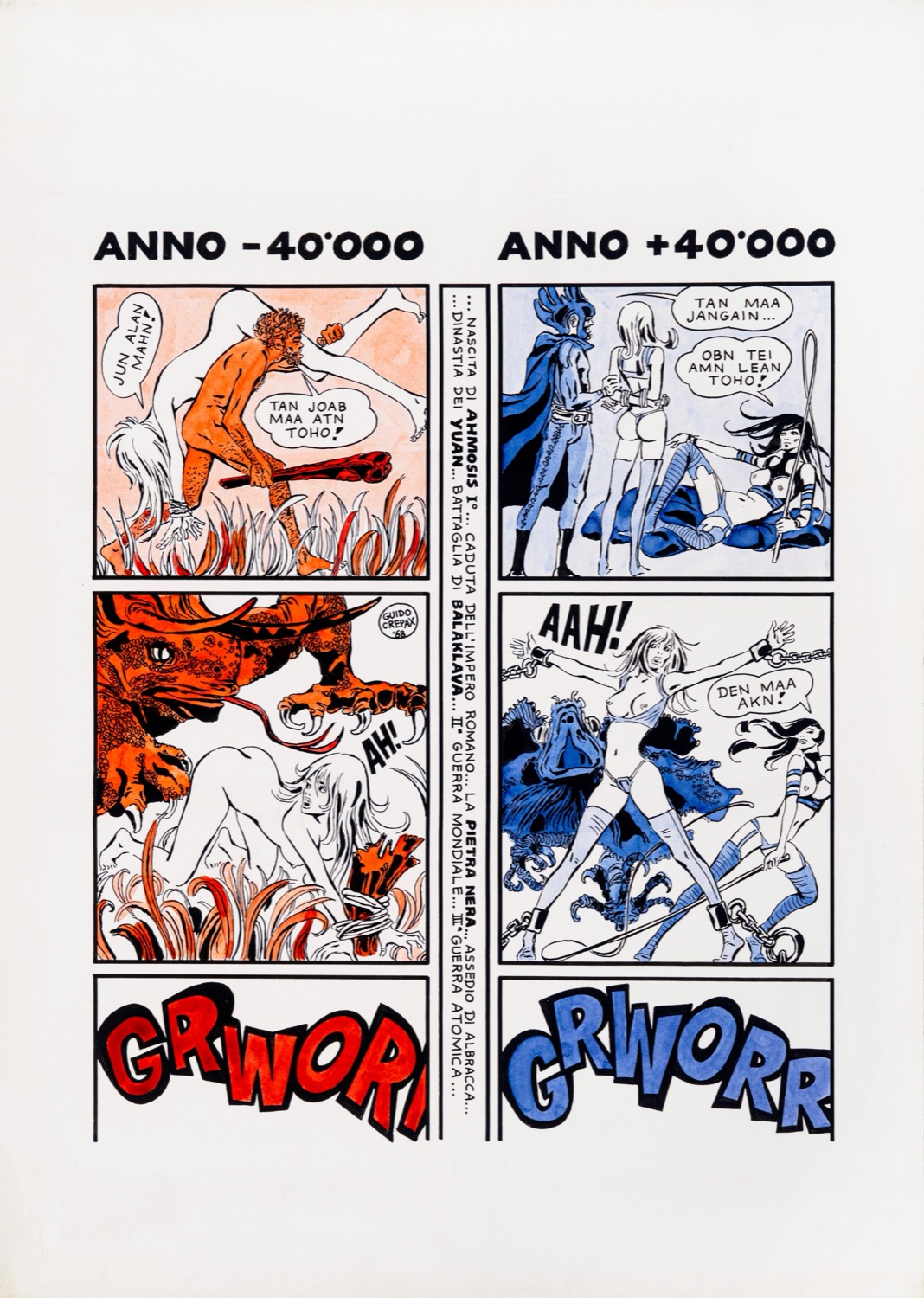 Tavola originale realizzata da Crepax intitolata "anno - 40.000 anno + 40.000", edita a piena pagina sulla rivista Sipra Uno n. 6 nel 1968. Un chiaro omaggio di Crepax alla Barbarella del collega francese Jean-Claude Forest, protagonista di caleidoscopio temporale di rara bellezza. Firmata e datata.
