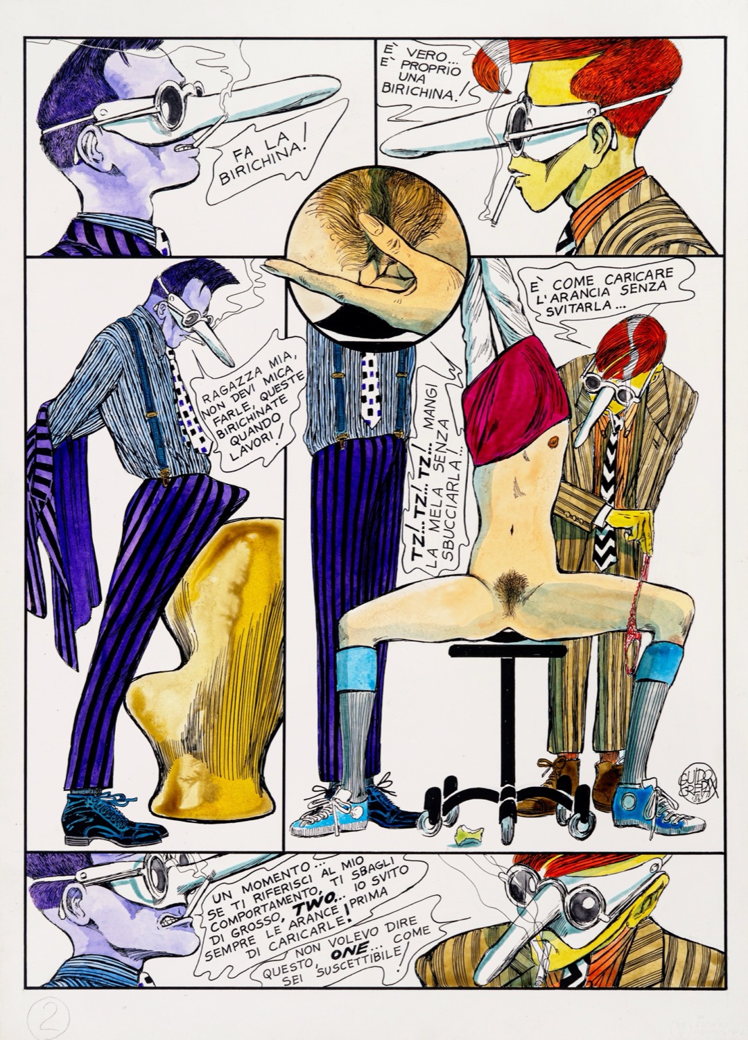 Tavola originale realizzata da Crepax per "Input Anita", edita per la prima volta a pag. 22 nel volume "Anita in diretta" dalla Olympia Press nel 1988. Crepax torna a raccontare le ossessioni che coinvolgono la giovane ed affascinante Anita e di come abbiano risvolti morbosi ed erotici nella sua vita, si ha così una sarabanda di situazioni erotiche che si susseguono senza soluzione di continuità con citazioni continue e suggestioni surreali: in questa pagina ritroviamo una chiara citazione al film "Arancia meccanica" di Stanley Kubrick. Firmata e datata.