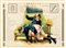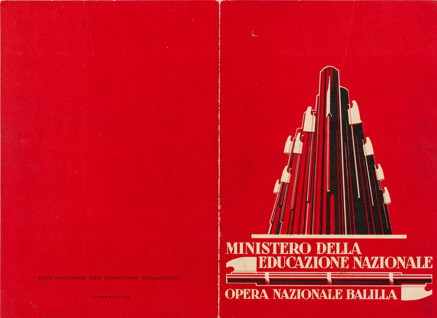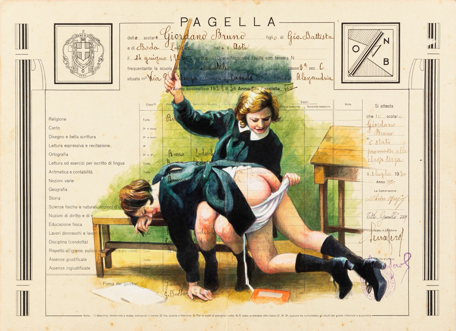 Disegno originale realizzato dalla Garelli su una pagella d‘epoca fascista del 1930, precisamente dell‘alunno Giordano Bruno di Casale Monferrato. Piega verticale al centro. Firmato e datato.